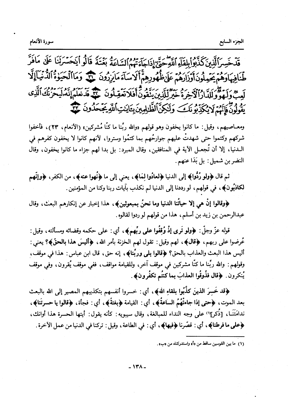 قَوْلُهُ عَزَّ وَجَلَّ: {وَلَوْ تَرَى إِذْ وُقِفُوا عَلَى رَبِّهِمْ} أَيْ: عَلَى حُكْمِهِ وَقَضَائِهِ وَمَسْأَلَتِهِ، وَقِيلَ: عُرِضُوا عَلَى رَبِّهِمْ، {قَالَ} لَهُمْ وَقِيلَ: تَقُولُ لَهُمُ الْخَزَنَةُ بِأَمْرِ اللَّهِ، {أَلَيْسَ هَذَا بِالْحَقِّ} ؟ يَعْنِي: أَلَيْسَ هَذَا الْبَعْثُ وَالْعَذَابُ بِالْحَقِّ؟ {قَالُوا بَلَى وَرَبِّنَا} إِنَّهُ حَقٌّ، قَالَ ابْنُ عَبَّاسٍ: هَذَا فِي مَوْقِفٍ، وَقَوْلُهُمْ: وَاللَّهِ رَبِّنَا مَا كُنَّا مُشْرِكِينَ فِي مَوْقِفٍ آخَرَ، وَفِي الْقِيَامَةِ مَوَاقِفُ، فَفِي مَوْقِفٍ يُقِرُّونَ، وَفِي مَوْقِفٍ يُنْكِرُونَ. {قَالَ فَذُوقُوا الْعَذَابَ بِمَا كُنْتُمْ تَكْفُرُونَ}
