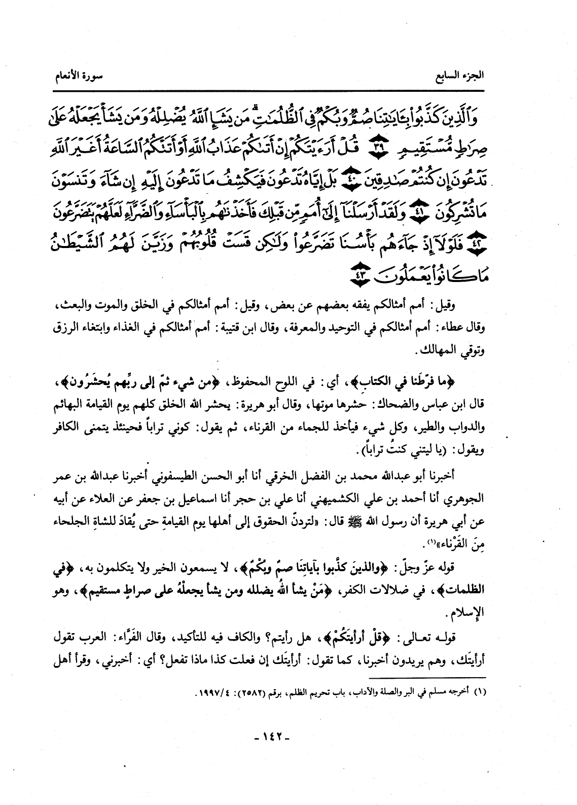 {مَا فَرَّطْنَا فِي الْكِتَابِ} أَيْ: فِي اللَّوْحِ الْمَحْفُوظِ، {مِنْ شَيْءٍ ثُمَّ إِلَى رَبِّهِمْ يُحْشَرُونَ} قَالَ ابْنُ عَبَّاسٍ وَالضَّحَّاكُ: حَشْرُهَا مَوْتُهَا، وَقَالَ أَبُو هُرَيْرَةَ: يَحْشُرُ اللَّهُ الْخَلْقَ كُلَّهُمْ يَوْمَ الْقِيَامَةِ الْبَهَائِمَ وَالدَّوَابَّ وَالطَّيْرَ، وَكُلَّ شَيْءٍ فَيَأْخُذُ لِلْجَمَّاءِ مِنَ الْقَرْنَاءِ، ثُمَّ يَقُولُ: كُونِي تُرَابًا فَحِينَئِذٍ يَتَمَنَّى الْكَافِرُ وَيَقُولُ: (يَا لَيْتَنِي كُنْتُ تُرَابًا) .