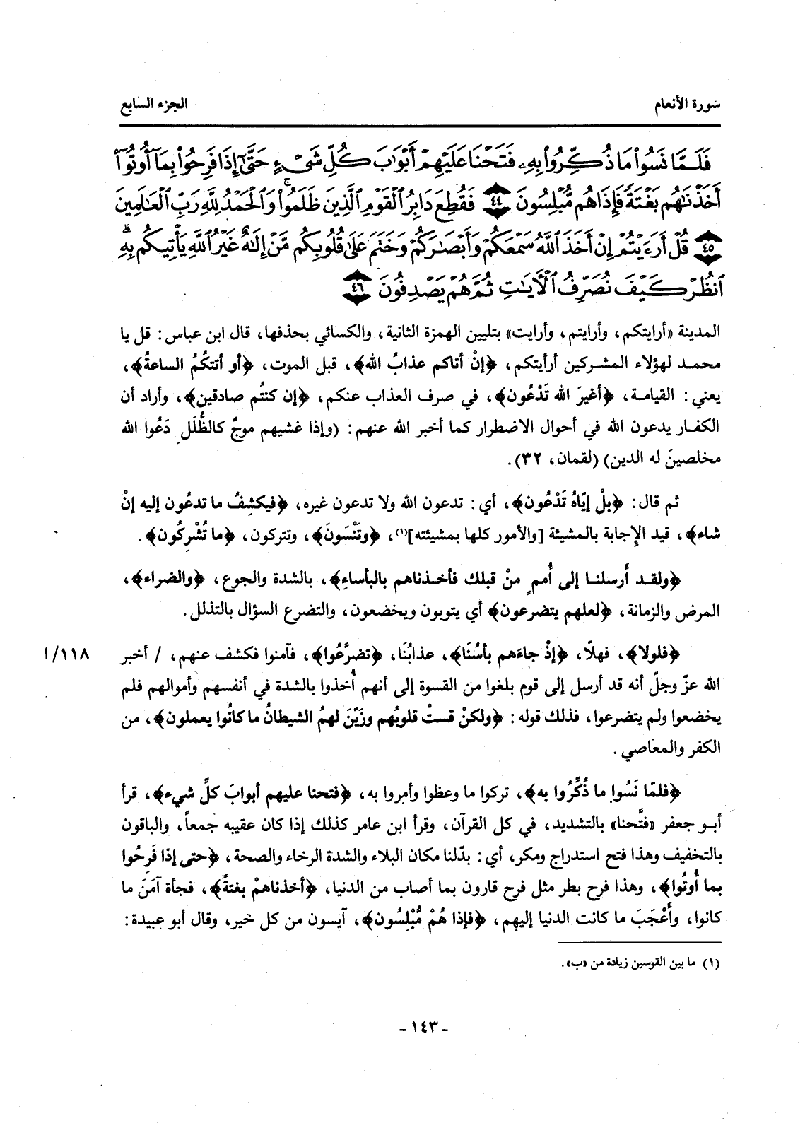 {فَلَمَّا نَسُوا مَا ذُكِّرُوا بِهِ} تَرَكُوا مَا وُعِظُوا وَأُمِرُوا بِهِ، {فَتَحْنَا عَلَيْهِمْ أَبْوَابَ كُلِّ شَيْءٍ} قَرَأَ أَبُو جَعْفَرٍ، "فَتَّحْنَا" بِالتَّشْدِيدِ، فِي كُلِّ الْقُرْآنِ، وَقَرَأَ ابْنُ عَامِرٍ كَذَلِكَ إِذَا كَانَ عُقَيْبَهُ جَمْعٌ وَالْبَاقُونَ بِالتَّخْفِيفِ وَهَذَا فَتْحُ اسْتِدْرَاجٍ وَمَكْرٍ، أَيْ: بَدَّلْنَا مَكَانَ الْبَلَاءِ وَالشِّدَّةِ الرَّخَاءَ وَالصِّحَّةَ، {حَتَّى إِذَا فَرِحُوا بِمَا أُوتُوا} وَهَذَا فَرَحُ بَطَرٍ مِثْلُ فَرَحِ قَارُونَ بِمَا أَصَابَ مِنَ الدُّنْيَا، {أَخَذْنَاهُمْ بَغْتَةً} فَجْأَةً آمَنَ مَا كَانُوا، وَأَعْجَبَ مَا كَانَتِ الدُّنْيَا إِلَيْهِمْ، {فَإِذَا هُمْ مُبْلِسُونَ} آيِسُونَ مِنْ كُلِّ خَيْرٍ، وَقَالَ أَبُو عُبَيْدَةَ: