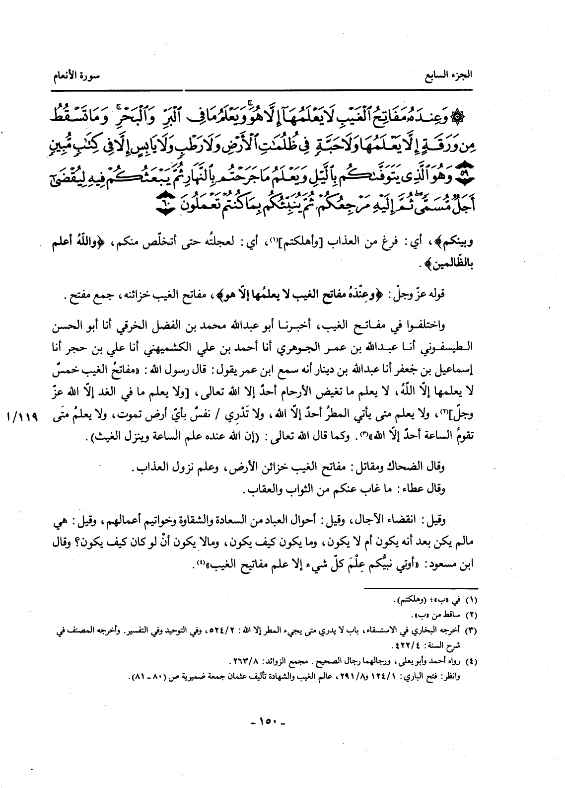 (2) أخرجه البخاري في الاستسقاء، باب لا يدري متى يجيء المطر إلا الله: 2 / 524، وفي التوحيد وفي التفسير. وأخرجه المصنف في شرح السنة: 4 / 422.