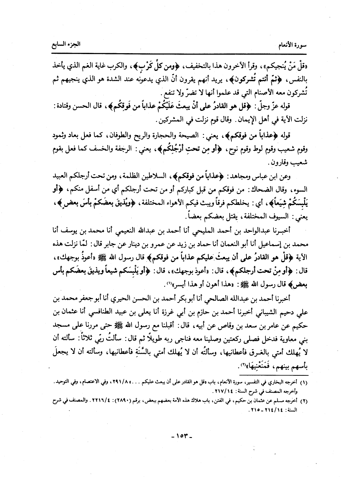 أَخْبَرَنَا عَبْدُ الْوَاحِدِ بْنُ أَحْمَدَ الْمُلَيْحِيُّ أَنَا أَحْمَدُ بْنُ عَبْدِ اللَّهِ النُّعَيْمِيُّ أَنَا مُحَمَّدُ بْنُ يُوسُفَ أَنَا مُحَمَّدُ بْنُ إِسْمَاعِيلَ أَنَا أَبُو النُّعْمَانَ أَنَا حَمَّادُ بْنُ زَيْدٍ عَنْ عَمْرِو بْنِ دِينَارٍ عَنْ جَابِرٍ قَالَ: لَمَّا نَزَلَتْ هَذِهِ الْآيَةُ {قُلْ هُوَ الْقَادِرُ عَلَى أَنْ يَبْعَثَ عَلَيْكُمْ عَذَابًا مِنْ فَوْقِكُمْ} قَالَ رَسُولُ اللَّهِ صَلَّى اللَّهُ عَلَيْهِ وَسَلَّمَ "أَعُوذُ بِوَجْهِكَ"، قَالَ: {أَوْ مِنْ تَحْتِ أَرْجُلِكُمْ} قَالَ: "أَعُوذُ بِوَجْهِكَ"، قَالَ: {أَوْ يَلْبِسَكُمْ شِيَعًا وَيُذِيقَ بَعْضَكُمْ بَأْسَ بَعْضٍ} قَالَ رَسُولُ اللَّهِ صَلَّى اللَّهُ عَلَيْهِ وَسَلَّمَ: "هَذَا أَهْوَنُ أَوْ هَذَا أَيْسَرُ" (1) .