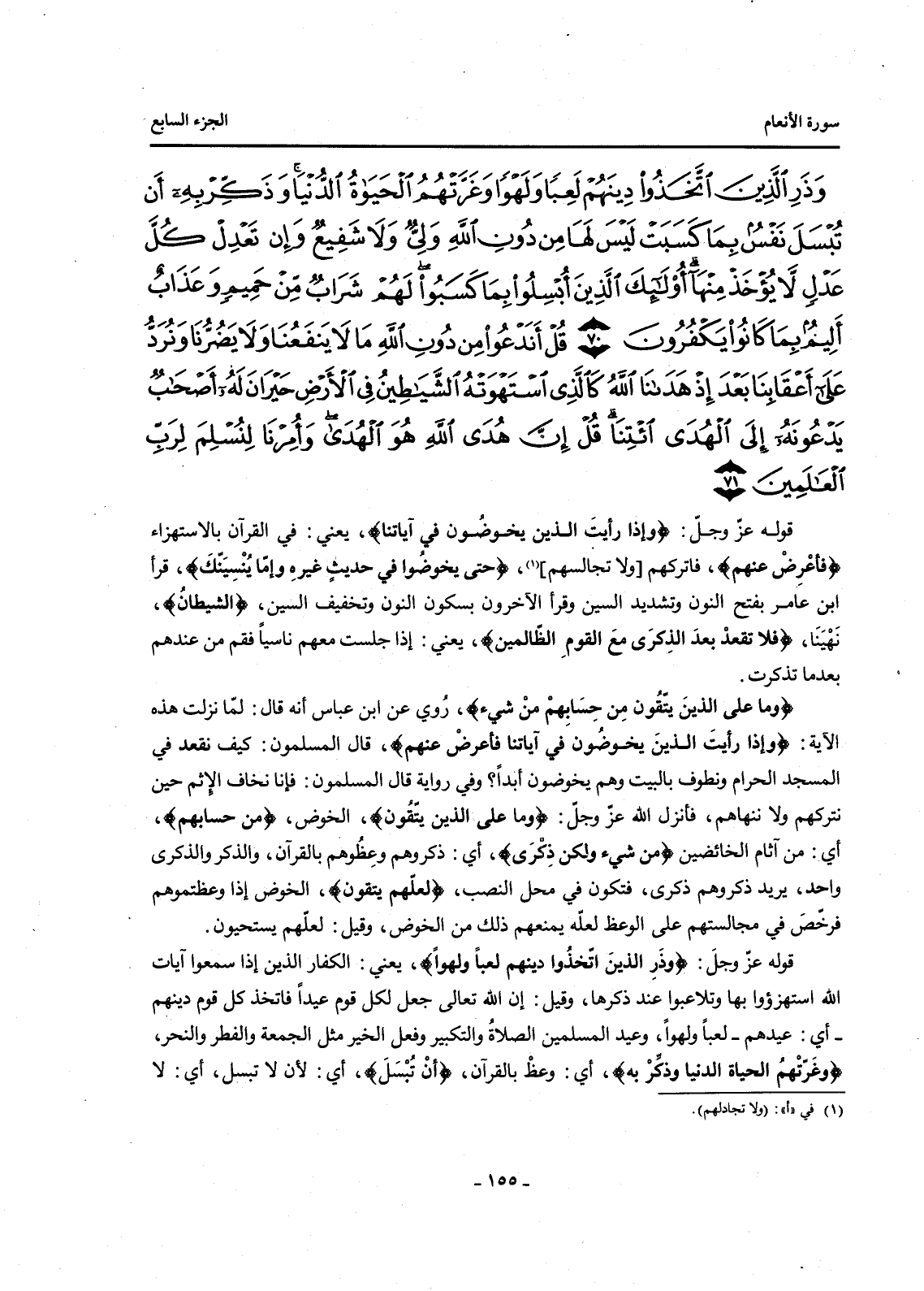 قَوْلُهُ عَزَّ وَجَلَّ: {وَذَرِ الَّذِينَ اتَّخَذُوا دِينَهُمْ لَعِبًا وَلَهْوًا} يَعْنِي: الْكُفَّارَ الَّذِينَ إِذَا سَمِعُوا آيَاتِ اللَّهِ اسْتَهْزَءُوا بِهَا وَتَلَاعَبُوا عِنْدَ ذِكْرِهَا، وَقِيلَ: إِنَّ اللَّهَ تَعَالَى جَعَلَ لِكُلِّ قَوْمٍ عِيدًا فَاتَّخَذَ كُلُّ قَوْمٍ دِينَهُمْ -أَيْ: عِيدَهُمْ -لَعِبًا وَلَهْوًا، وَعِيدُ الْمُسْلِمِينَ الصَّلَاةُ وَالتَّكْبِيرُ وَفِعْلُ الْخَيْرِ مِثْلُ الْجُمُعَةِ وَالْفِطْرِ وَالنَّحْرِ، {وَغَرَّتْهُمُ الْحَيَاةُ الدُّنْيَا وَذَكِّرْ بِهِ} أَيْ: وَعِظْ بِالْقُرْآنِ، {أَنْ تُبْسَلَ} أَيْ: لِأَنْ لَا تُبْسَلَ، أَيْ: لَا