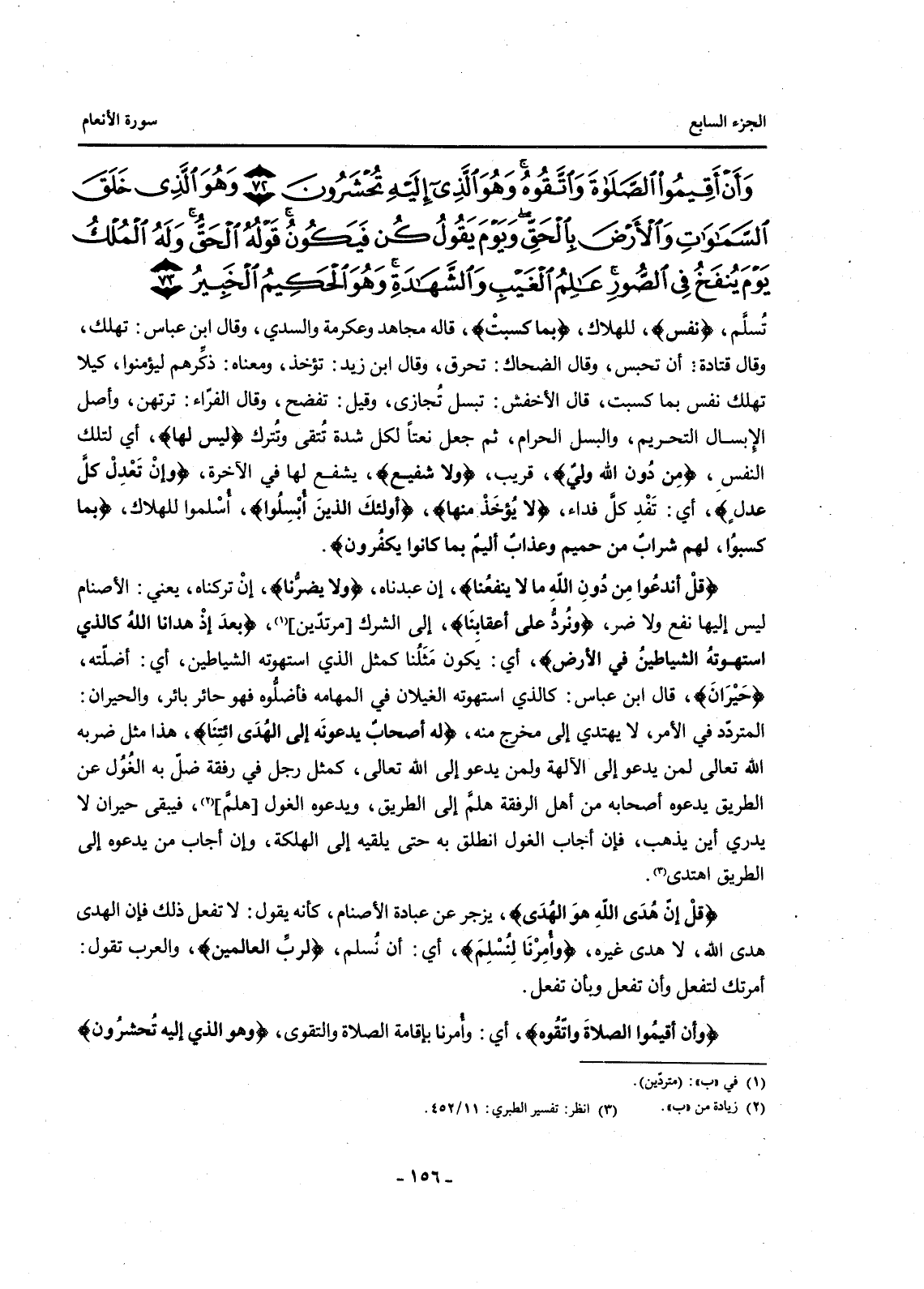 {وَأَنْ أَقِيمُوا الصَّلَاةَ وَاتَّقُوهُ وَهُوَ الَّذِي إِلَيْهِ تُحْشَرُونَ (72) وَهُوَ الَّذِي خَلَقَ السَّمَاوَاتِ وَالْأَرْضَ بِالْحَقِّ وَيَوْمَ يَقُولُ كُنْ فَيَكُونُ قَوْلُهُ الْحَقُّ وَلَهُ الْمُلْكُ يَوْمَ يُنْفَخُ فِي الصُّورِ عَالِمُ الْغَيْبِ وَالشَّهَادَةِ وَهُوَ الْحَكِيمُ الْخَبِيرُ (73) }