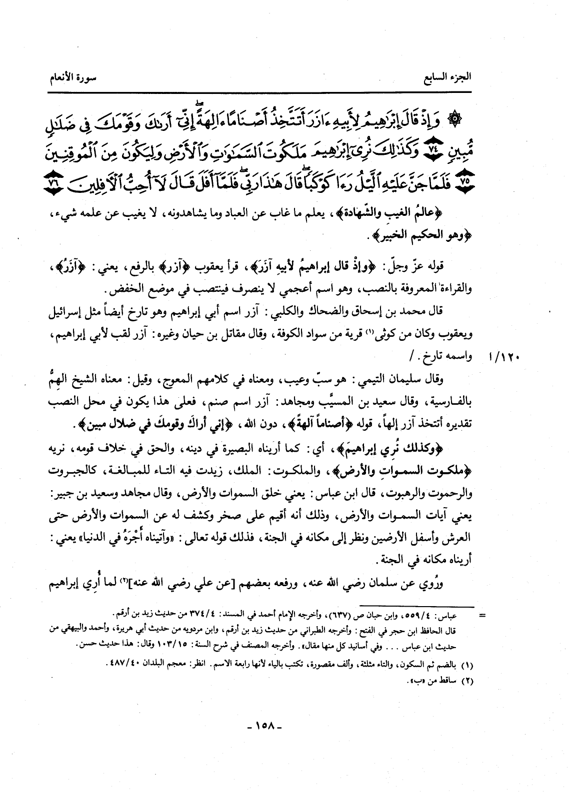 {وَإِذْ قَالَ إِبْرَاهِيمُ لِأَبِيهِ آزَرَ أَتَتَّخِذُ أَصْنَامًا آلِهَةً إِنِّي أَرَاكَ وَقَوْمَكَ فِي ضَلَالٍ مُبِينٍ (74) وَكَذَلِكَ نُرِي إِبْرَاهِيمَ مَلَكُوتَ السَّمَاوَاتِ وَالْأَرْضِ وَلِيَكُونَ مِنَ الْمُوقِنِينَ (75) فَلَمَّا جَنَّ عَلَيْهِ اللَّيْلُ رَأَى كَوْكَبًا قَالَ هَذَا رَبِّي فَلَمَّا أَفَلَ قَالَ لَا أُحِبُّ الْآفِلِينَ (76) }