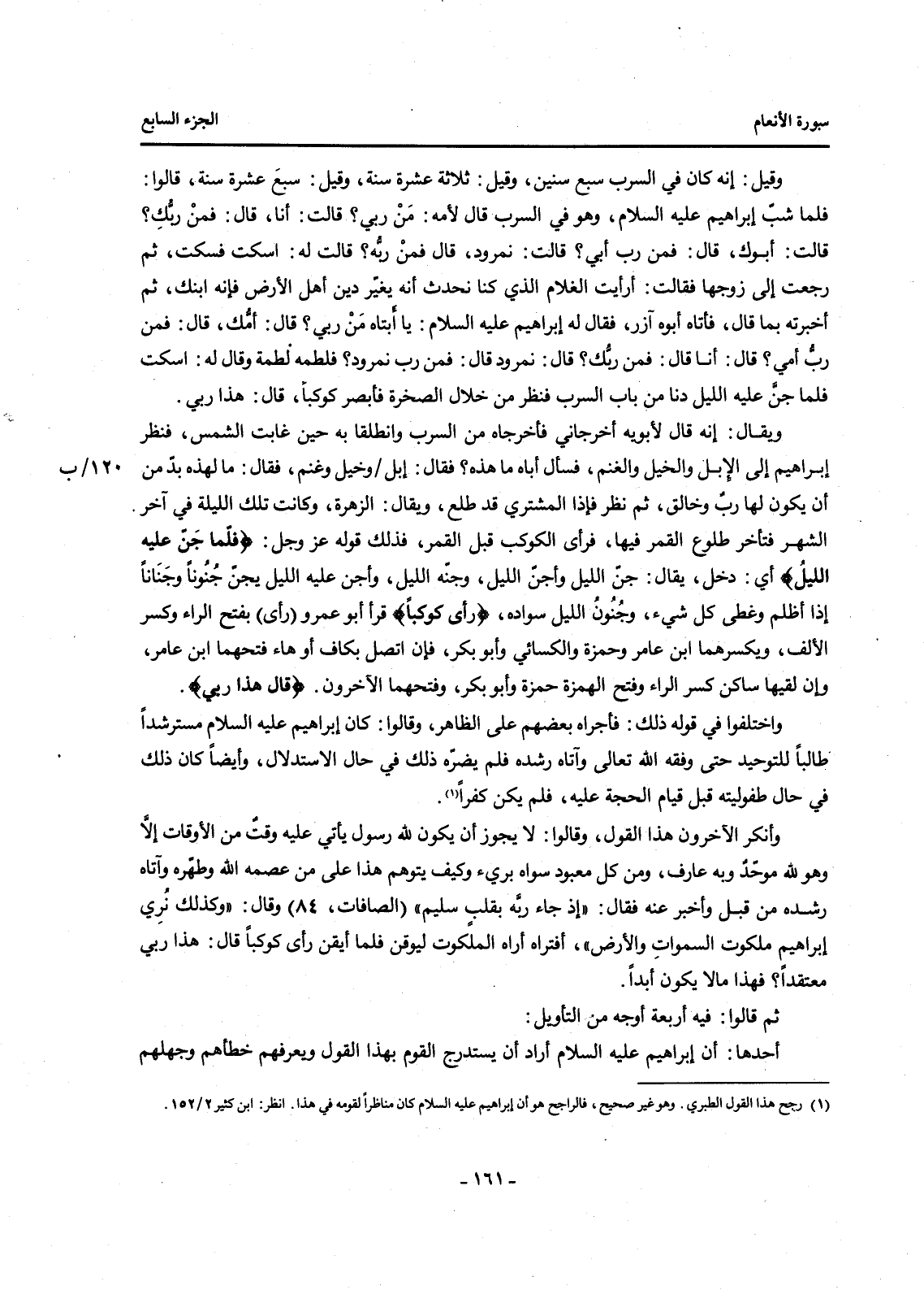 وَاخْتَلَفُوا فِي قَوْلِهِ ذَلِكَ: فَأَجْرَاهُ بَعْضُهُمْ عَلَى الظَّاهِرِ، وَقَالُوا: كَانَ إِبْرَاهِيمُ عَلَيْهِ السَّلَامُ مُسْتَرْشِدًا طَالِبًا لِلتَّوْحِيدِ حَتَّى وَفَّقَهُ اللَّهُ تَعَالَى وَآتَاهُ رُشْدَهُ فَلَمْ يَضُرُّهُ ذَلِكَ فِي حَالِ الِاسْتِدْلَالِ، وَأَيْضًا كَانَ ذَلِكَ في حال طفوليته قَبْلَ قِيَامِ الْحُجَّةِ عَلَيْهِ، فَلَمْ يَكُنْ كُفْرًا (1) .