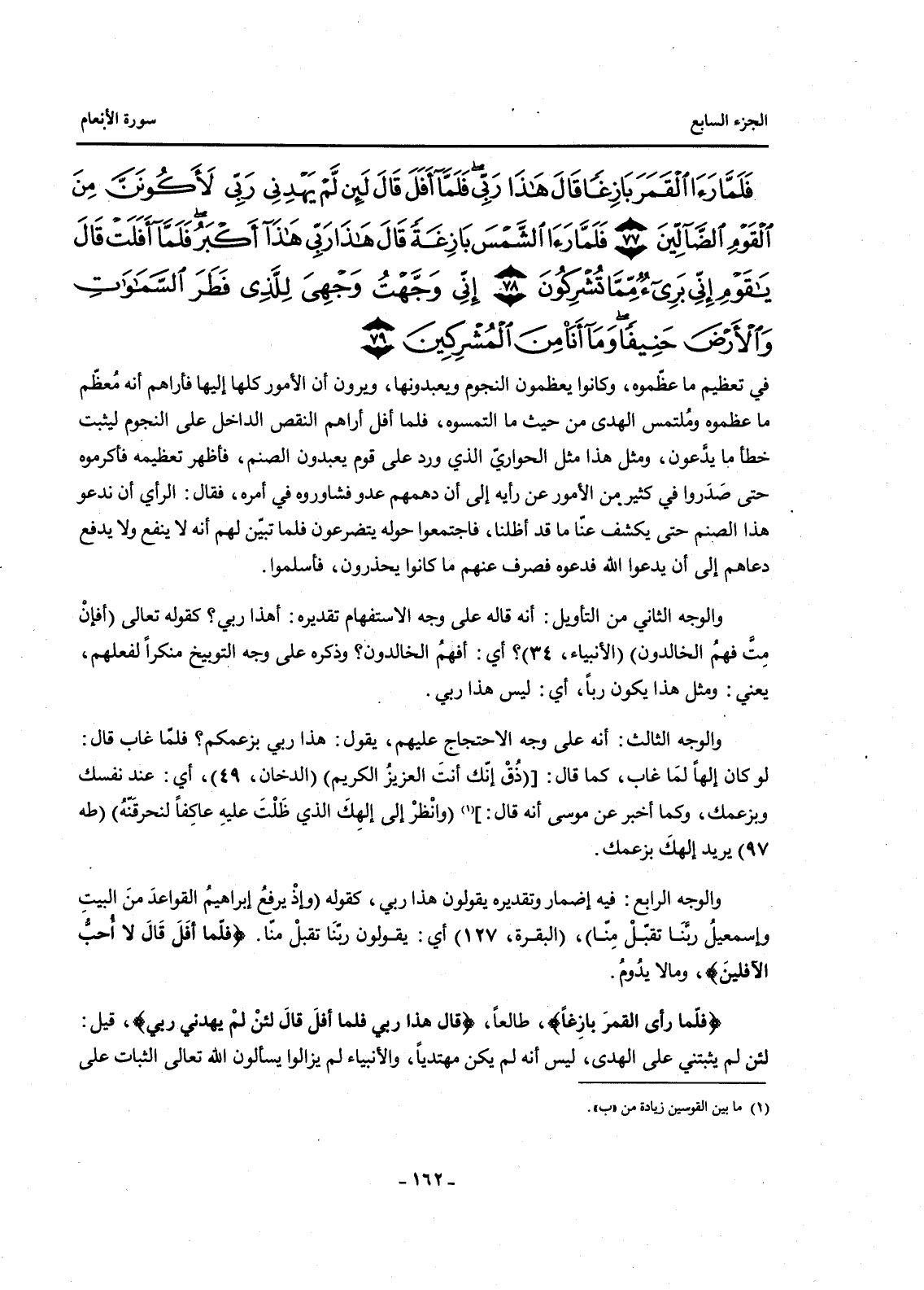 {فَلَمَّا رَأَى الْقَمَرَ بَازِغًا قَالَ هَذَا رَبِّي فَلَمَّا أَفَلَ قَالَ لَئِنْ لَمْ يَهْدِنِي رَبِّي لَأَكُونَنَّ مِنَ الْقَوْمِ الضَّالِّينَ (77) فَلَمَّا رَأَى الشَّمْسَ بَازِغَةً قَالَ هَذَا رَبِّي هَذَا أَكْبَرُ فَلَمَّا أَفَلَتْ قَالَ يَا قَوْمِ إِنِّي بَرِيءٌ مِمَّا تُشْرِكُونَ (78) إِنِّي وَجَّهْتُ وَجْهِيَ لِلَّذِي فَطَرَ السَّمَاوَاتِ وَالْأَرْضَ حَنِيفًا وَمَا أَنَا مِنَ الْمُشْرِكِينَ (79) }