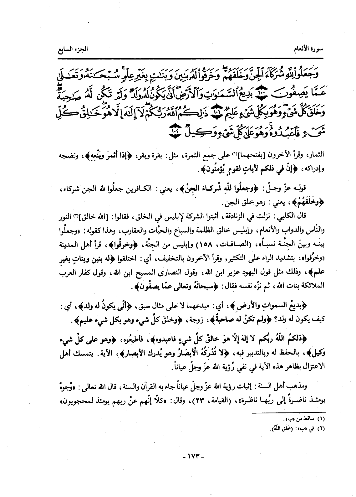 {وَجَعَلُوا لِلَّهِ شُرَكَاءَ الْجِنَّ وَخَلَقَهُمْ وَخَرَقُوا لَهُ بَنِينَ وَبَنَاتٍ بِغَيْرِ عِلْمٍ سُبْحَانَهُ وَتَعَالَى عَمَّا يَصِفُونَ (100) بَدِيعُ السَّمَاوَاتِ وَالْأَرْضِ أَنَّى يَكُونُ لَهُ وَلَدٌ وَلَمْ تَكُنْ لَهُ صَاحِبَةٌ وَخَلَقَ كُلَّ شَيْءٍ وَهُوَ بِكُلِّ شَيْءٍ عَلِيمٌ (101) }