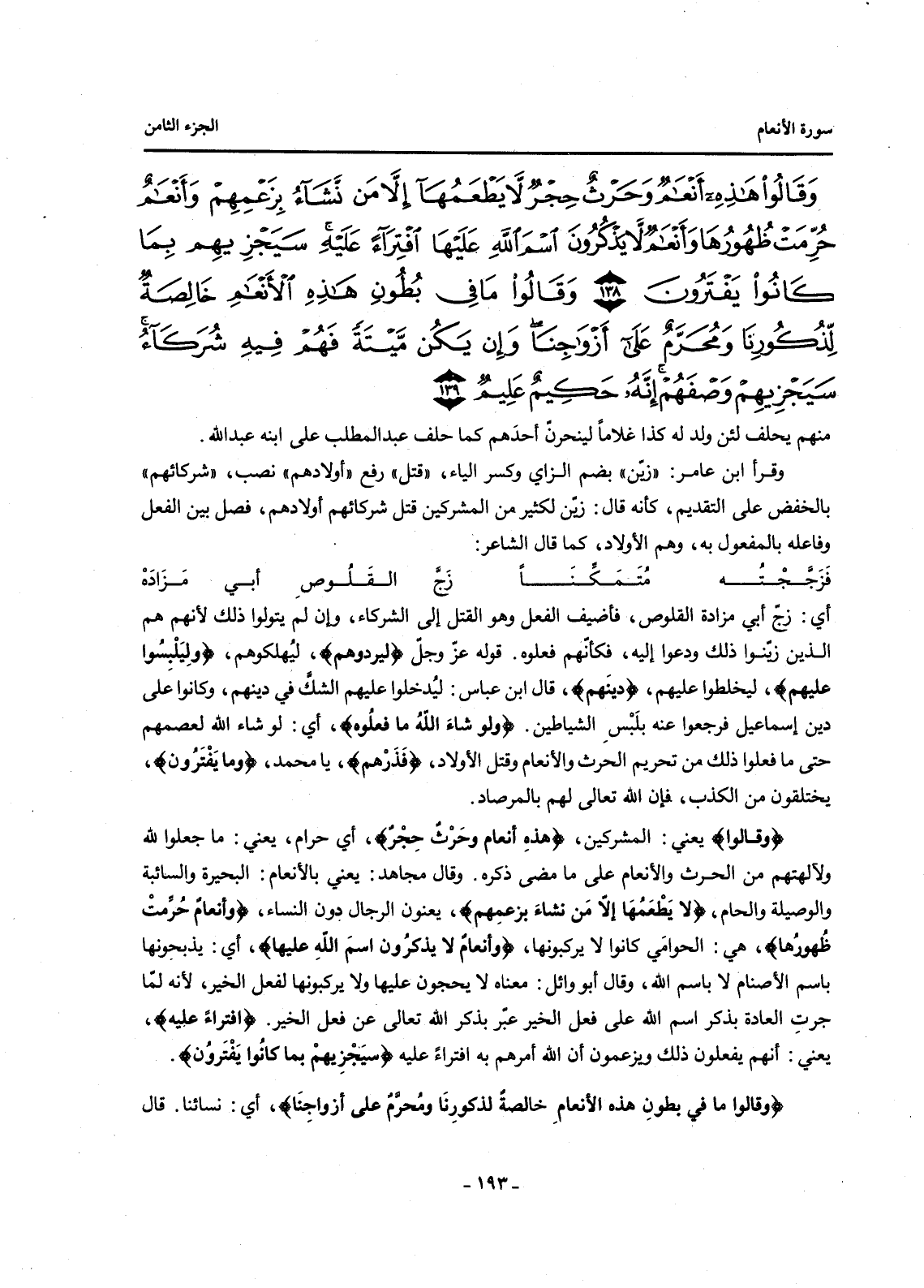 {وَقَالُوا هَذِهِ أَنْعَامٌ وَحَرْثٌ حِجْرٌ لَا يَطْعَمُهَا إِلَّا مَنْ نَشَاءُ بِزَعْمِهِمْ وَأَنْعَامٌ حُرِّمَتْ ظُهُورُهَا وَأَنْعَامٌ لَا يَذْكُرُونَ اسْمَ اللَّهِ عَلَيْهَا افْتِرَاءً عَلَيْهِ سَيَجْزِيهِمْ بِمَا كَانُوا يَفْتَرُونَ (138) وَقَالُوا مَا فِي بُطُونِ هَذِهِ الْأَنْعَامِ خَالِصَةٌ لِذُكُورِنَا وَمُحَرَّمٌ عَلَى أَزْوَاجِنَا وَإِنْ يَكُنْ مَيْتَةً فَهُمْ فِيهِ شُرَكَاءُ سَيَجْزِيهِمْ وَصْفَهُمْ إِنَّهُ حَكِيمٌ عَلِيمٌ (139) }