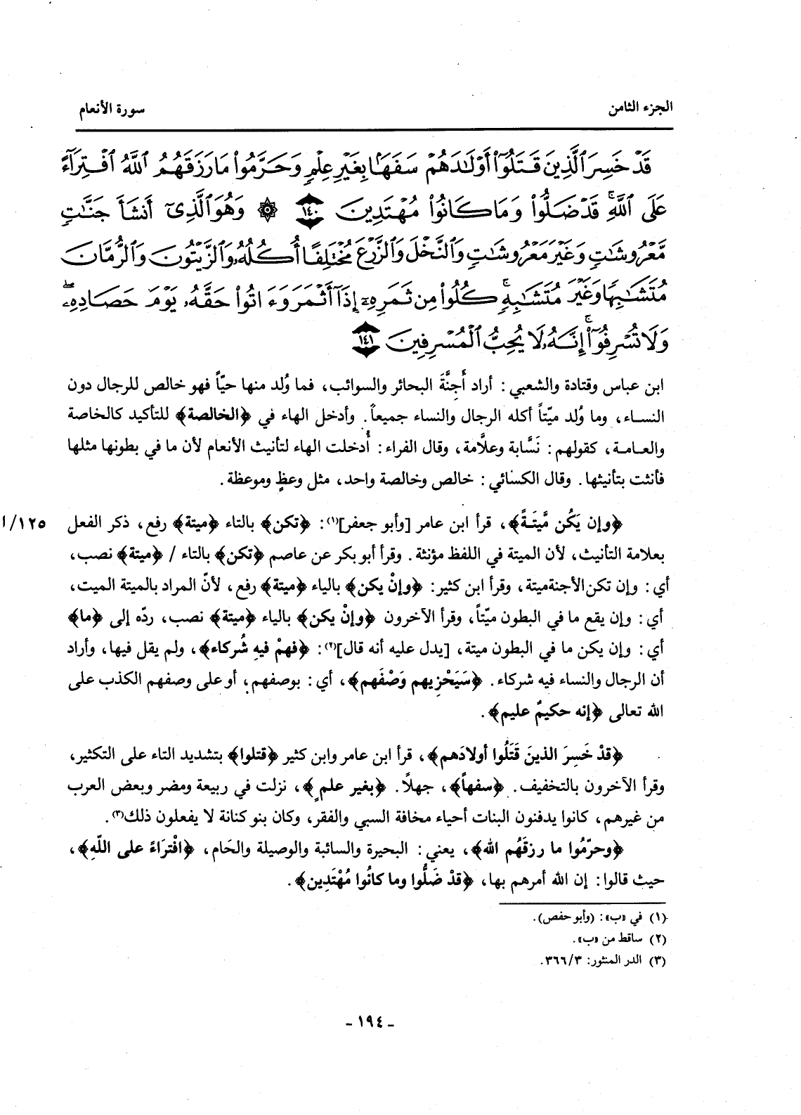 {وَإِنْ يَكُنْ مَيْتَةً} قَرَأَ ابْنُ عَامِرٍ [وَأَبُو جَعْفَرٍ] (1) " تَكُنْ " بِالتَّاءِ {مَيْتَةٌ} رَفْعٌ، ذَكَرَ الْفِعْلَ بِعَلَامَةِ التَّأْنِيثِ، لِأَنَّ الْمَيْتَةَ فِي اللَّفْظِ مُؤَنَّثَةٌ. وَقَرَأَ أَبُو بَكْرٍ عَنْ عَاصِمٍ " تكن " بالتاء 125\أ {مَيْتَةً} نَصْبٌ، أَيْ: وَإِنْ تَكُنِ الْأَجِنَّةُ مَيْتَةً، وَقَرَأَ ابْنُ كَثِيرٍ: {وَإِنْ يَكُنْ} بِالْيَاءِ {مَيْتَةٌ} رَفْعٌ، لِأَنَّ الْمُرَادَ بِالْمَيْتَةِ الْمَيِّتُ، أَيْ: وَإِنْ يَقَعْ مَا فِي الْبُطُونِ مَيِّتًا، وَقَرَأَ الْآخَرُونَ {وَإِنْ يَكُنْ} بِالْيَاءِ {مَيْتَةً} نَصْبٌ، رَدَّهُ إِلَى {مَا} أَيْ: وَإِنْ يَكُنْ مَا فِي الْبُطُونِ مَيْتَةً، [يَدُلُّ عَلَيْهِ أَنَّهُ قَالَ] (2) {فَهُمْ فِيهِ شُرَكَاءُ} وَلَمْ يَقُلْ فِيهَا، وَأَرَادَ أَنَّ الرِّجَالَ وَالنِّسَاءَ فِيهِ شُرَكَاءُ، {سَيَجْزِيهِمْ وَصْفَهُمْ} أَيْ: بِوَصْفِهِمْ، أَوْ عَلَى وَصْفِهِمُ الْكَذِبَ عَلَى اللَّهِ تَعَالَى {إِنَّهُ حَكِيمٌ عَلِيمٌ}