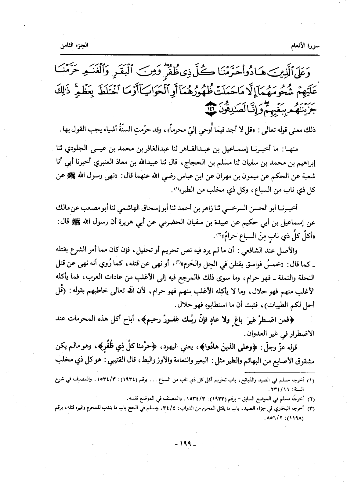 {وَعَلَى الَّذِينَ هَادُوا حَرَّمْنَا كُلَّ ذِي ظُفُرٍ وَمِنَ الْبَقَرِ وَالْغَنَمِ حَرَّمْنَا عَلَيْهِمْ شُحُومَهُمَا إِلَّا مَا حَمَلَتْ ظُهُورُهُمَا أَوِ الْحَوَايَا أَوْ مَا اخْتَلَطَ بِعَظْمٍ ذَلِكَ جَزَيْنَاهُمْ بِبَغْيِهِمْ وَإِنَّا لَصَادِقُونَ (146) }