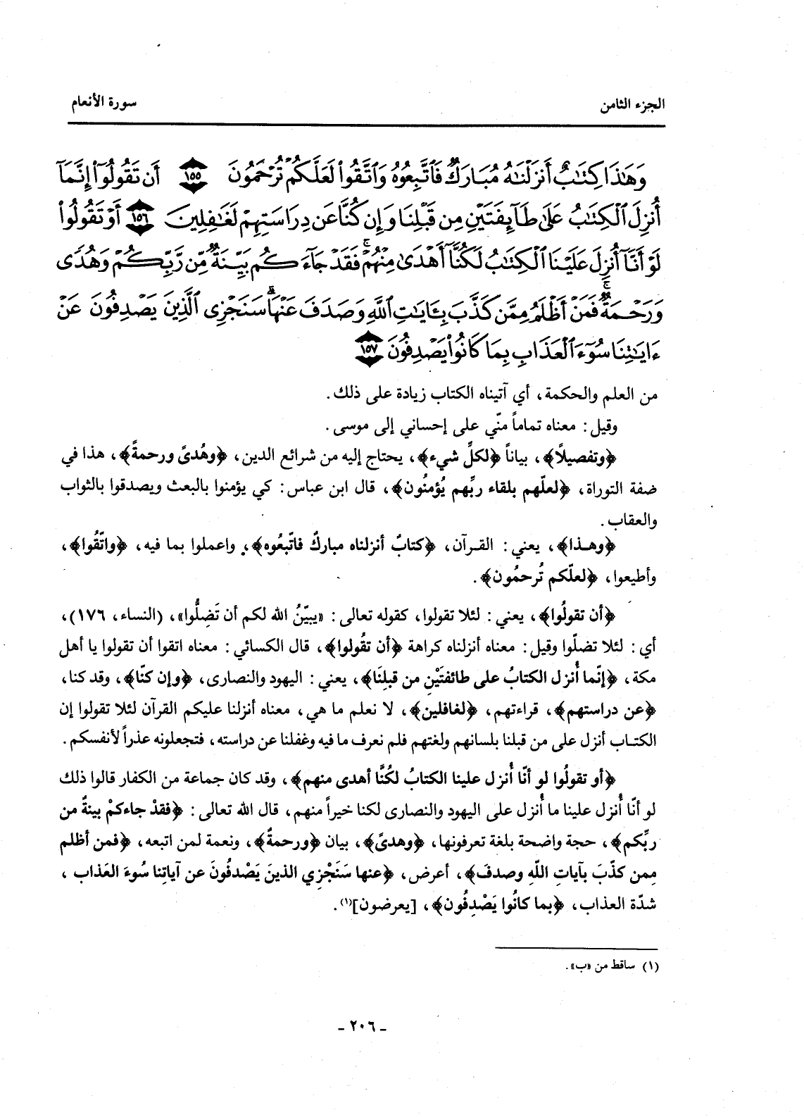 {وَهَذَا كِتَابٌ أَنْزَلْنَاهُ مُبَارَكٌ فَاتَّبِعُوهُ وَاتَّقُوا لَعَلَّكُمْ تُرْحَمُونَ (155) أَنْ تَقُولُوا إِنَّمَا أُنْزِلَ الْكِتَابُ عَلَى طَائِفَتَيْنِ مِنْ قَبْلِنَا وَإِنْ كُنَّا عَنْ دِرَاسَتِهِمْ لَغَافِلِينَ (156) أَوْ تَقُولُوا لَوْ أَنَّا أُنْزِلَ عَلَيْنَا الْكِتَابُ لَكُنَّا أَهْدَى مِنْهُمْ فَقَدْ جَاءَكُمْ بَيِّنَةٌ مِنْ رَبِّكُمْ وَهُدًى وَرَحْمَةٌ فَمَنْ أَظْلَمُ مِمَّنْ كَذَّبَ بِآيَاتِ اللَّهِ وَصَدَفَ عَنْهَا سَنَجْزِي الَّذِينَ يَصْدِفُونَ عَنْ آيَاتِنَا سُوءَ الْعَذَابِ بِمَا كَانُوا يَصْدِفُونَ (157) }