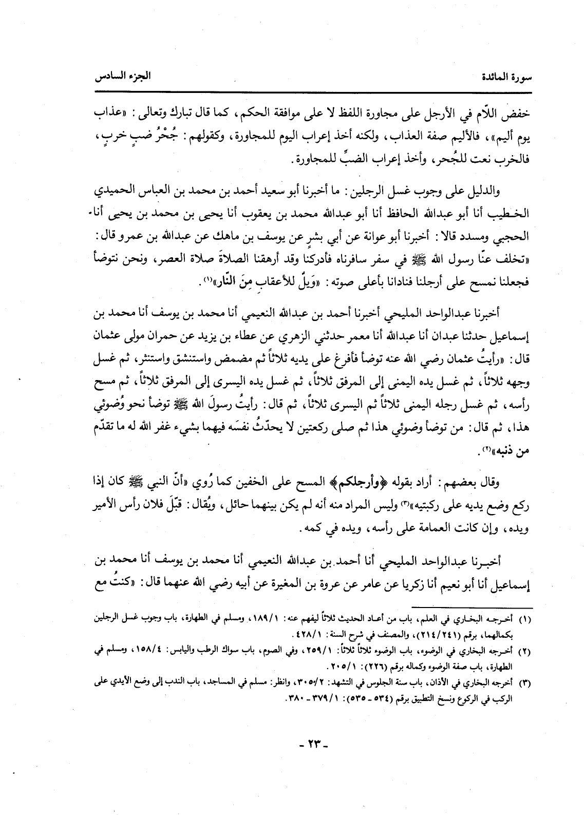 وَالدَّلِيلُ عَلَى وُجُوبِ غَسْلِ الرِّجْلَيْنِ: مَا أَخْبَرَنَا أَبُو سَعِيدٍ أَحْمَدُ بْنُ مُحَمَّدِ بْنِ الْعَبَّاسِ الْحُمَيْدِيُّ الْخَطِيبُ أَنَا أَبُو عَبْدِ اللَّهِ الْحَافِظُ أَنَا أَبُو عَبْدِ اللَّهِ مُحَمَّدُ بْنُ يَعْقُوبَ أَنَا يَحْيَى بْنُ مُحَمَّدِ بْنِ يَحْيَى أَنَا الْحَجَبِيُّ وَمُسَدَّدٌ قَالَا أَخْبَرَنَا أَبُو عَوَانَةَ عَنْ أَبِي بِشْرٍ عَنْ يُوسُفَ بْنِ مَاهِكٍ عَنْ عَبْدِ اللَّهِ بْنِ عَمْرٍو قَالَ: "تَخَلَّفَ عَنَّا رَسُولُ اللَّهِ صَلَّى اللَّهُ عَلَيْهِ وَسَلَّمَ فِي سَفَرٍ سَافَرْنَاهُ فَأَدْرَكَنَا وَقَدْ أَرْهَقَتْنَا الصَّلَاةُ صَلَاةُ الْعَصْرِ، وَنَحْنُ نَتَوَضَّأُ فَجَعَلْنَا نَمْسَحُ عَلَى أَرْجُلِنَا فَنَادَانَا بِأَعْلَى صَوْتِهِ: "وَيْلٌ لِلْأَعْقَابِ مِنَ النَّارِ". (1)