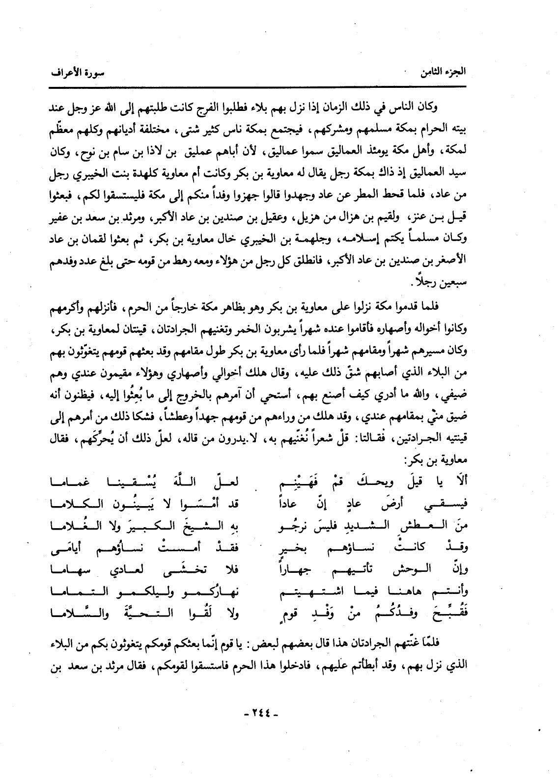 فَلَمَّا قَدِمُوا مَكَّةَ نَزَلُوا عَلَى مُعَاوِيَةَ بْنِ بَكْرٍ وَهُوَ بِظَاهِرِ مَكَّةَ خَارِجًا مِنَ الْحَرَمِ، فَأَنْزَلَهُمْ وَأَكْرَمَهُمْ وَكَانُوا أَخْوَالَهُ وَأَصْهَارَهُ فَأَقَامُوا عِنْدَهُ شَهْرًا يَشْرَبُونَ الْخَمْرَ وَتُغَنِّيهِمُ الْجَرَادَتَانِ، قَيْنَتَانِ لِمُعَاوِيَةَ بْنِ بَكْرٍ، وَكَانَ مَسِيِرُهُمْ شَهْرًا وَمَقَامُهُمْ شَهْرًا فَلَمَّا رَأَى مُعَاوِيَةُ بْنُ بَكْرٍ طُولَ مَقَامِهِمْ وَقَدْ بَعَثَهُمْ قَوْمُهُمْ يَتَغَوَّثُونَ بِهِمْ مِنَ الْبَلَاءِ الَّذِي أَصَابَهُمْ شَقَّ ذَلِكَ عَلَيْهِ، وَقَالَ هَلَكَ أَخْوَالِي وَأَصْهَارِي وَهَؤُلَاءِ مُقِيمُونَ عِنْدِي وَهُمْ ضَيْفِي، وَاللَّهِ مَا أَدْرِي كَيْفَ أَصْنَعُ بِهِمْ، أَسْتَحِي أَنْ آمُرَهُمْ بِالْخُرُوجِ إِلَى مَا بُعِثُوا إِلَيْهِ، فَيَظُنُّونَ أَنَّهُ ضِيقٌ مِنِّي بِمَقَامِهِمْ عِنْدِي، وَقَدْ هَلَكَ مَنْ وَرَاءَهُمْ مِنْ قَوْمِهِمْ جُهْدًا وَعَطَشَا، فَشَكَا ذَلِكَ مِنْ أَمْرِهِمْ إِلَى قَيْنَتَيْهِ الْجَرَادَتَيْنِ، فَقَالَتَا: قُلْ شِعْرًا نُغَنِّيهِمْ بِهِ، لَا يَدْرُونَ مَنْ قَالَهُ، لَعَلَّ ذَلِكَ أَنْ يُحَرِّكَهُمْ، فَقَالَ مُعَاوِيَةُ بْنُ بَكْرٍ: أَلَا يَا قَيْلُ وَيْحَكَ قُمْ فَهَيْنِمْ ... لَعَلَّ اللَّهَ يَسْقِينَا غَمَامَا