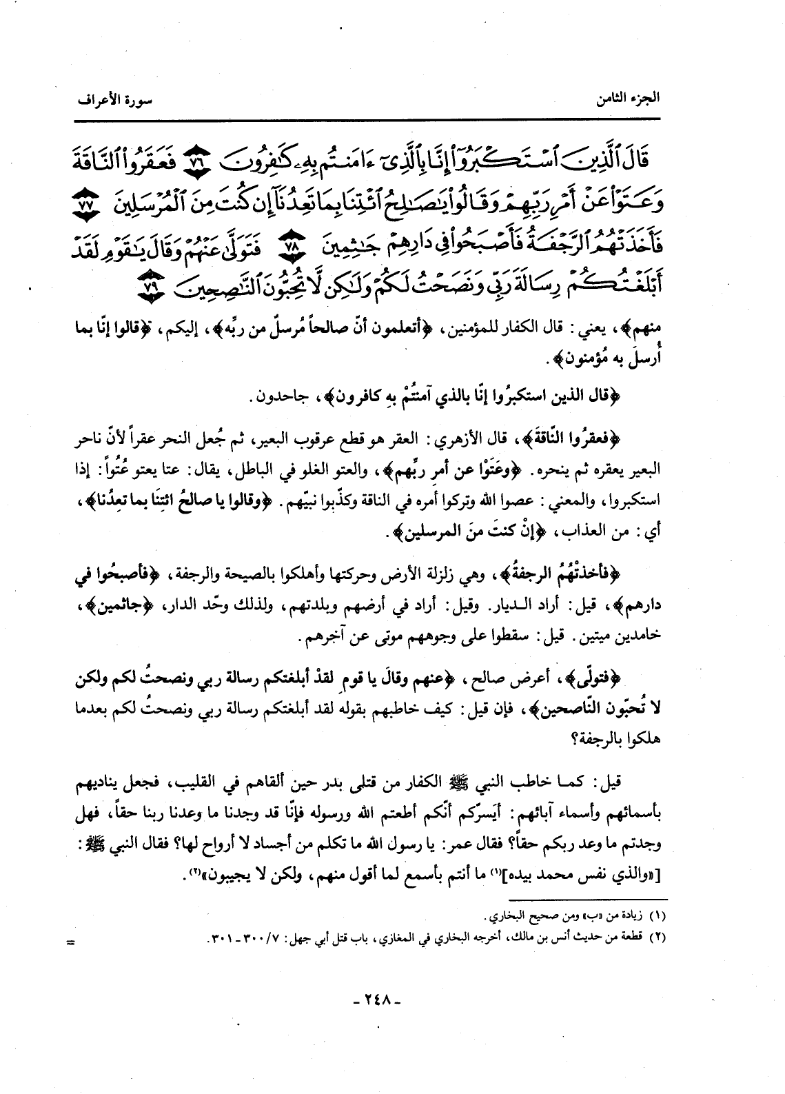 {قَالَ الَّذِينَ اسْتَكْبَرُوا إِنَّا بِالَّذِي آمَنْتُمْ بِهِ كَافِرُونَ (76) فَعَقَرُوا النَّاقَةَ وَعَتَوْا عَنْ أَمْرِ رَبِّهِمْ وَقَالُوا يَا صَالِحُ ائْتِنَا بِمَا تَعِدُنَا إِنْ كُنْتَ مِنَ الْمُرْسَلِينَ (77) فَأَخَذَتْهُمُ الرَّجْفَةُ فَأَصْبَحُوا فِي دَارِهِمْ جَاثِمِينَ (78) فَتَوَلَّى عَنْهُمْ وَقَالَ يَا قَوْمِ لَقَدْ أَبْلَغْتُكُمْ رِسَالَةَ رَبِّي وَنَصَحْتُ لَكُمْ وَلَكِنْ لَا تُحِبُّونَ النَّاصِحِينَ (79) }