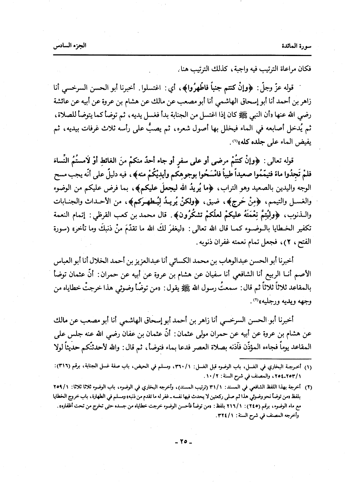 قَوْلُهُ عَزَّ وَجَلَّ: {وَإِنْ كُنْتُمْ جُنُبًا فَاطَّهَّرُوا} أَيِ: اغْتَسِلُوا، أَخْبَرَنَا أَبُو الْحَسَنِ السَّرَخْسِيُّ أَنَا زَاهِرُ بْنُ أَحْمَدَ أَنَا أَبُو إِسْحَاقَ الْهَاشِمِيُّ أَنَا أَبُو مُصْعَبٍ عَنْ مَالِكٍ عَنْ هِشَامِ بْنِ عُرْوَةَ عَنْ أَبِيهِ عَنْ عَائِشَةَ رَضِيَ اللَّهُ عَنْهَا "أَنَّ النَّبِيَّ صَلَّى اللَّهُ عَلَيْهِ وَسَلَّمَ كَانَ إِذَا اغْتَسَلَ مِنَ الْجَنَابَةِ بَدَأَ فَغَسَلَ يَدَيْهِ، ثُمَّ تَوَضَّأَ كَمَا يَتَوَضَّأُ لِلصَّلَاةِ، ثُمَّ يُدْخِلُ أَصَابِعَهُ فِي الْمَاءِ فَيُخَلِّلُ بِهَا أُصُولَ شَعْرِهِ، ثُمَّ يَصُبُّ عَلَى رَأْسِهِ ثَلَاثَ غَرْفَاتٍ بِيَدَيْهِ، ثُمَّ يُفِيضُ الْمَاءَ عَلَى جِلْدِهِ كُلِّهِ" (1)