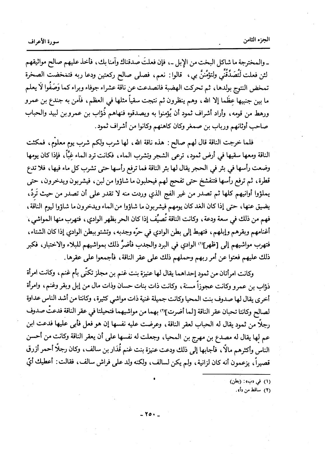 وَكَانَتِ امْرَأَتَانِ مِنْ ثَمُودَ إِحْدَاهُمَا يُقَالُ لَهَا عُنَيْزَةُ بِنْتُ غَنْمِ بْنِ مِجْلِزِ تُكَنَّى بِأُمِّ غَنْمٍ، وَكَانَتِ امْرَأَةَ ذُؤَابِ بْنِ عَمْرٍو وَكَانَتْ عَجُوزًا مُسِنَّةً، وَكَانَتْ ذَاتَ بَنَاتٍ حِسَانٍ وَذَاتَ مَالٍ مِنْ إِبِلٍ وَبَقَرٍ وَغَنَمٍ، وَامْرَأَةٌ أُخْرَى يُقَالُ لَهَا صُدُوفُ بِنْتُ الْمَحْيَا وَكَانَتْ جَمِيلَةً غَنِيَّةً ذَاتَ مواشي كَثِيرَةٍ، وَكَانَتَا مِنْ أَشَدِّ النَّاسِ عَدَاوَةً لِصَالِحٍ وَكَانَتَا تُحِبَّانِ عَقْرَ النَّاقَةِ [لِمَا أَضَرَّتْ] (2) بِهِمَا مِنْ مَوَاشِيهِمَا فَتَحَيَّلَتَا فِي عَقْرِ النَّاقَةِ فَدَعَتْ صَدُوفُ رَجُلًا مِنْ ثَمُودَ يُقَالُ لَهُ الْحُبَابُ لِعَقْرِ النَّاقَةِ، وَعَرَضَتْ عَلَيْهِ نَفْسَهَا إِنْ هُوَ فَعَلَ فَأَبَى عَلَيْهَا فَدَعَتِ ابْنَ عَمٍّ لَهَا يُقَالُ لَهُ مُصَدَّعُ بْنُ مُهَرِّجِ بْنِ الْمَحْيَا، وَجَعَلَتْ لَهُ نَفْسَهَا عَلَى أَنْ يَعْقِرَ النَّاقَةَ وَكَانَتْ مِنْ أَحْسَنِ النَّاسِ وَأَكْثَرِهِمْ مَالًا فَأَجَابَهَا إِلَى ذَلِكَ وَدَعَتْ عُنَيْزَةُ بِنْتُ غَنْمٍ قِدَارَ بْنَ سَالِفٍ، وَكَانَ رَجُلًا أَحْمَرَ أَزْرَقَ قَصِيرًا، يَزْعُمُونَ أَنَّهُ كَانَ لِزَانِيَةٍ، وَلَمْ يَكُنْ لِسَالِفٍ، وَلَكِنَّهُ وُلِدَ عَلَى فِرَاشِ سَالِفٍ، فَقَالَتْ: أُعْطِيكَ أَيَّ