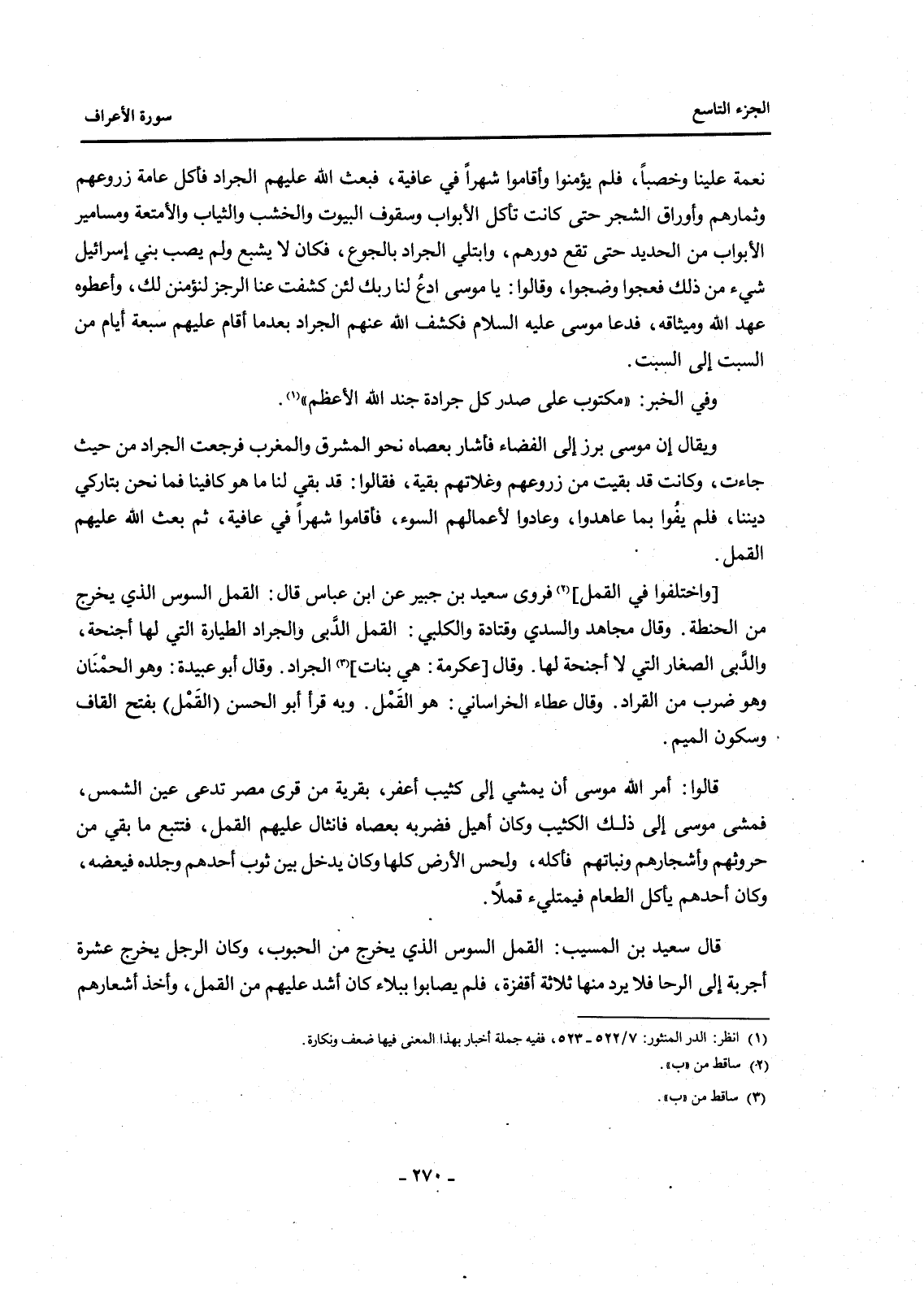 وَيُقَالُ إِنَّ مُوسَى بَرَزَ إِلَى الْفَضَاءِ فَأَشَارَ بِعَصَاهُ نَحْوَ الْمَشْرِقِ وَالْمَغْرِبِ فَرَجَعَتِ الْجَرَادُ مِنْ حَيْثُ جَاءَتْ، وَكَانَتْ قَدْ بَقِيَتْ مِنْ زُرُوعِهِمْ وَغَلَّاتِهِمْ بَقِيَّةٌ، فَقَالُوا: قَدْ بَقِيَ لَنَا مَا هُوَ كَافِينَا فَمَا نَحْنُ بِتَارِكِي دِينِنَا، فَلَمْ يَفُوا بِمَا عَاهَدُوا، وَعَادُوا لِأَعْمَالِهِمِ السُّوءِ، فَأَقَامُوا شَهْرًا فِي عَافِيَةٍ، ثُمَّ بَعَثَ اللَّهُ عَلَيْهِمُ الْقُمَّلَ.