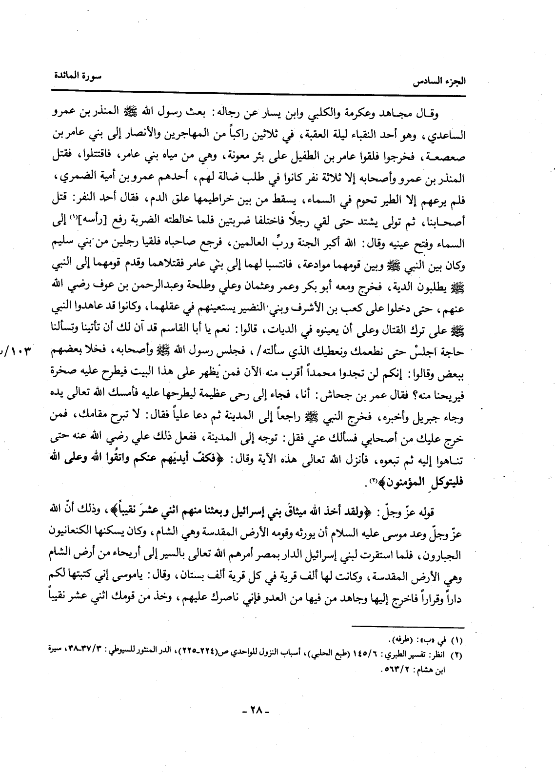 وَقَالَ مُجَاهِدٌ وَعِكْرِمَةُ وَالْكَلْبِيُّ وَابْنُ يَسَارٍ عَنْ رِجَالِهِ: بَعَثَ رَسُولُ اللَّهِ صَلَّى اللَّهُ عَلَيْهِ وَسَلَّمَ الْمُنْذِرَ بْنَ عَمْرٍو السَّاعِدِيَّ، وَهُوَ أَحَدُ النُّقَبَاءُ لَيْلَةَ الْعَقَبَةِ، فِي ثَلَاثِينَ رَاكِبًا مِنَ الْمُهَاجِرِينَ وَالْأَنْصَارِ إِلَى بَنِي عَامِرِ بْنِ صَعْصَعَةَ، فَخَرَجُوا فَلَقَوْا عَامِرَ بْنَ الطُّفَيْلِ عَلَى بِئْرِ مَعُونَةَ، وَهِيَ مِنْ مِيَاهِ بَنِي عَامِرٍ، فَاقْتَتَلُوا، فَقُتِلَ الْمُنْذِرُ بْنُ عَمْرٍو وَأَصْحَابُهُ إِلَّا ثَلَاثَةَ نَفَرٍ كَانُوا فِي طَلَبِ ضَالَّةٍ لَهُمْ، أَحَدُهُمْ عَمْرُو بْنُ أُمَيَّةَ الضَّمْرِيُّ، فَلَمْ يَرُعْهُمْ إِلَّا الطَّيْرُ تَحُومُ فِي السَّمَاءِ، يَسْقُطُ مِنْ بَيْنِ خَرَاطِيمِهَا عَلَقُ الدَّمِ، فَقَالَ أَحَدُ النَّفَرِ: قُتِلَ أَصْحَابُنَا، ثُمَّ تَوَلَّى يَشْتَدُّ حَتَّى لَقِيَ رَجُلًا فَاخْتَلَفَا ضَرْبَتَيْنِ فَلَمَّا خَالَطَتْهُ الضَّرْبَةُ رَفْعَ [رَأَسَهُ] (1) إِلَى السَّمَاءِ وَفَتَحَ عَيْنَيْهِ وَقَالَ: اللَّهُ أَكْبَرُ الْجَنَّةُ وَرَبِّ الْعَالَمِينَ، فَرَجَعَ صَاحِبَاهُ فَلَقِيَا رَجُلَيْنِ مِنْ بَنِي سَلِيمٍ وَكَانَ بَيْنَ النَّبِيِّ صَلَّى اللَّهُ عَلَيْهِ وَسَلَّمَ وَبَيْنَ قَوْمِهِمَا مُوَادَعَةٌ، فَانْتَسَبَا لَهُمَا إِلَى بَنِي عَامِرٍ فَقَتْلَاهُمَا وَقَدِمَ قَوْمُهُمَا إِلَى النَّبِيِّ صَلَّى اللَّهُ عَلَيْهِ وَسَلَّمَ يَطْلُبُونَ الدِّيَةَ، فَخَرَجَ وَمَعَهُ أَبُو بَكْرٍ وَعُمَرُ وَعُثْمَانُ وَعَلِيٌّ وَطَلْحَةُ وَعَبْدُ الرَّحْمَنِ بْنُ عَوْفٍ رَضِيَ اللَّهُ عَنْهُمْ، حَتَّى دَخَلُوا عَلَى كَعْبِ بْنِ الْأَشْرَفِ وَبَنِي النَّضِيرِ يَسْتَعِينُهُمْ فِي عَقْلِهِمَا، وَكَانُوا قَدْ عَاهَدُوا النَّبِيَّ صَلَّى اللَّهُ عَلَيْهِ وَسَلَّمَ عَلَى تَرْكِ الْقِتَالِ وَعَلَى أَنْ يُعِينُوهُ فِي الدِّيَاتِ، قَالُوا: نَعَمْ يَا أَبَا الْقَاسِمِ قَدْ آنَ لَكَ أَنْ تَأْتِيَنَا وَتَسْأَلَنَا حَاجَةً اجْلِسْ حَتَّى نُطْعِمَكَ وَنُعْطِيَكَ الذي سألته 103/ب فَجَلَسَ رَسُولُ اللَّهِ صَلَّى اللَّهُ عَلَيْهِ وَسَلَّمَ وَأَصْحَابُهُ، فَخَلَا بَعْضُهُمْ بِبَعْضٍ وَقَالُوا: إِنَّكُمْ لَنْ تَجِدُوا مُحَمَّدًا أَقْرَبَ مِنْهُ الْآنَ فَمَنْ يَظْهَرُ عَلَى هَذَا الْبَيْتِ فَيَطْرَحُ عَلَيْهِ صَخْرَةً فَيُرِيحُنَا مِنْهُ؟ فَقَالَ عُمَرُ بْنُ جَحَّاشٍ: أَنَا، فَجَاءَ إِلَى رَحًى عَظِيمَةٍ لِيَطْرَحَهَا عَلَيْهِ فَأَمْسَكَ اللَّهُ تَعَالَى يَدَهُ وَجَاءَ جِبْرِيلُ وَأَخْبَرَهُ، فَخَرَجَ النَّبِيُّ صَلَّى اللَّهُ عَلَيْهِ وَسَلَّمَ رَاجِعًا إِلَى الْمَدِينَةِ ثُمَّ دَعَا عَلِيًّا فَقَالَ: لَا تَبْرَحْ مَقَامَكَ، فَمَنْ خَرَجَ عَلَيْكَ مِنْ أَصْحَابِي فَسَأَلَكَ عَنِّي فَقُلْ: تَوَجَّهَ إِلَى الْمَدِينَةِ، فَفَعَلَ ذَلِكَ عَلِيٌّ رَضِيَ اللَّهُ عَنْهُ حَتَّى تَنَاهَوْا إِلَيْهِ ثُمَّ تَبِعُوهُ، فَأَنْزَلَ اللَّهُ تَعَالَى هَذِهِ الْآيَةَ وَقَالَ: {فَكَفَّ أَيْدِيَهُمْ عَنْكُمْ وَاتَّقُوا اللَّهَ وَعَلَى اللَّهِ فَلْيَتَوَكَّلِ الْمُؤْمِنُونَ} (2) .