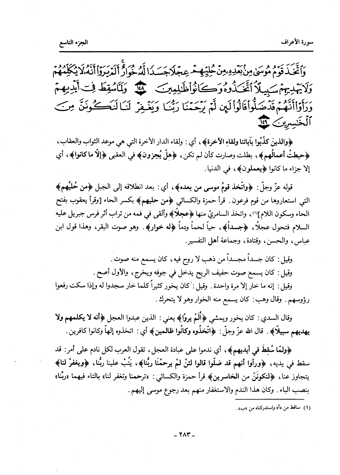 {وَاتَّخَذَ قَوْمُ مُوسَى مِنْ بَعْدِهِ مِنْ حُلِيِّهِمْ عِجْلًا جَسَدًا لَهُ خُوَارٌ أَلَمْ يَرَوْا أَنَّهُ لَا يُكَلِّمُهُمْ وَلَا يَهْدِيهِمْ سَبِيلًا اتَّخَذُوهُ وَكَانُوا ظَالِمِينَ (148) وَلَمَّا سُقِطَ فِي أَيْدِيهِمْ وَرَأَوْا أَنَّهُمْ قَدْ ضَلُّوا قَالُوا لَئِنْ لَمْ يَرْحَمْنَا رَبُّنَا وَيَغْفِرْ لَنَا لَنَكُونَنَّ مِنَ الْخَاسِرِينَ (149) }