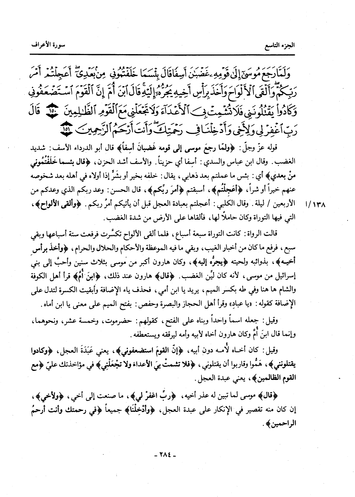 {وَلَمَّا رَجَعَ مُوسَى إِلَى قَوْمِهِ غَضْبَانَ أَسِفًا قَالَ بِئْسَمَا خَلَفْتُمُونِي مِنْ بَعْدِي أَعَجِلْتُمْ أَمْرَ رَبِّكُمْ وَأَلْقَى الْأَلْوَاحَ وَأَخَذَ بِرَأْسِ أَخِيهِ يَجُرُّهُ إِلَيْهِ قَالَ ابْنَ أُمَّ إِنَّ الْقَوْمَ اسْتَضْعَفُونِي وَكَادُوا يَقْتُلُونَنِي فَلَا تُشْمِتْ بِيَ الْأَعْدَاءَ وَلَا تَجْعَلْنِي مَعَ الْقَوْمِ الظَّالِمِينَ (150) قَالَ رَبِّ اغْفِرْ لِي وَلِأَخِي وَأَدْخِلْنَا فِي رَحْمَتِكَ وَأَنْتَ أَرْحَمُ الرَّاحِمِينَ (151) }