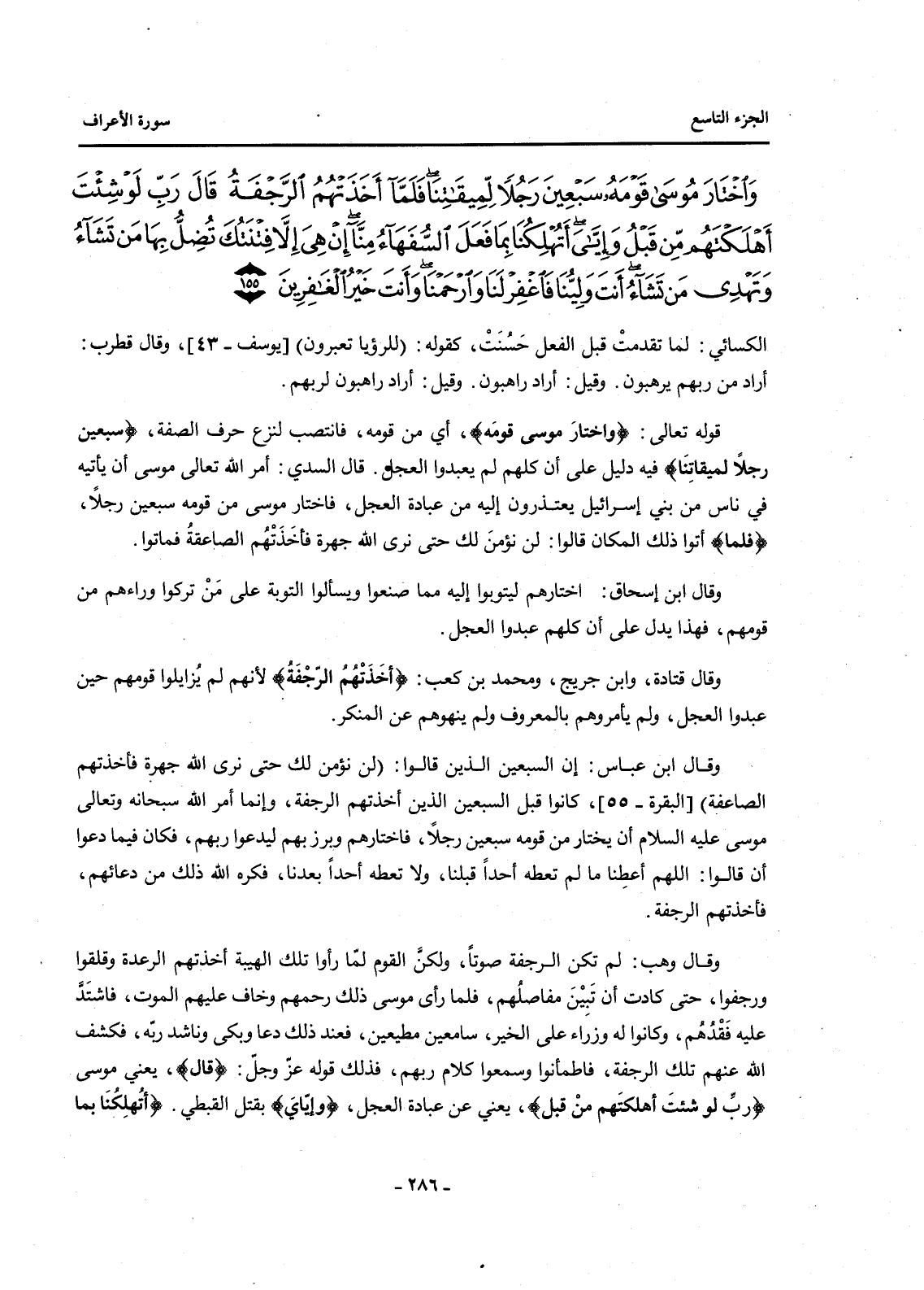 وَقَالَ ابْنُ عَبَّاسٍ: إِنَّ السَّبْعِينَ الَّذِينَ قَالُوا: (لَنْ نُؤْمِنَ لَكَ حَتَّى نَرَى الله جهرة فأخذتهم الصَّاعِقَةُ) [الْبَقَرَةُ-55] ، كَانُوا قَبْلَ السَّبْعِينَ الَّذِينَ أَخَذَتْهُمُ الرَّجْفَةُ، وَإِنَّمَا أَمَرَ اللَّهُ سُبْحَانَهُ وَتَعَالَى مُوسَى عَلَيْهِ السَّلَامُ أَنْ يَخْتَارَ مِنْ قَوْمِهِ سَبْعِينَ رَجُلًا فَاخْتَارَهُمْ وَبَرَزَ بِهِمْ لِيَدْعُوا رَبَّهُمْ، فَكَانَ فِيمَا دَعَوْا أَنْ قَالُوا: اللَّهُمَّ أَعْطِنَا مَا لَمْ تُعْطِهِ أَحَدًا قَبْلَنَا، وَلَا تُعْطِهِ أَحَدًا بَعْدَنَا، فَكَرِهَ اللَّهُ ذَلِكَ مِنْ دُعَائِهِمْ، فَأَخَذَتْهُمُ الرَّجْفَةُ.
