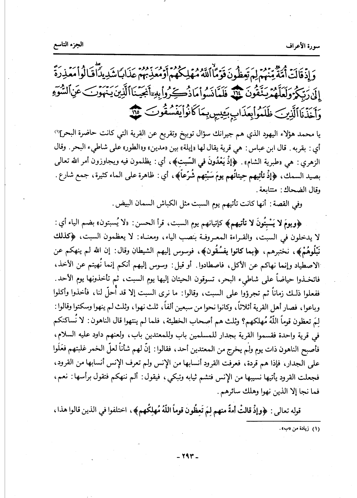 يَا مُحَمَّدُ هؤلاء اليهود الذي هُمْ جِيرَانُكَ سُؤَالَ تَوْبِيخٍ وَتَقْرِيعٍ عَنِ الْقَرْيَةِ الَّتِي كَانَتْ حَاضِرَةَ الْبَحْرِ] (1) أَيْ: بِقُرْبِهِ. قَالَ ابْنُ عَبَّاسٍ: هِيَ قَرْيَةٌ يُقَالُ لَهَا "إِيَلَةُ" بَيْنَ "مَدْيَنَ" وَ"الطُّورِ" عَلَى شَاطِئِ الْبَحْرِ. وَقَالَ الزُّهْرِيُّ: هِيَ "طَبَرِيَّةُ الشَّامِ". {إِذْ يَعْدُونَ فِي السَّبْتِ} أَيْ: يَظْلِمُونَ فِيهِ وَيُجَاوِزُونَ أَمْرَ اللَّهُ تَعَالَى بِصَيْدِ السَّمَكِ، إِذْ تَأْتِيهِمْ حِيتَانُهُمْ يَوْمَ سَبْتِهِمْ شُرَّعًا أَيْ: ظَاهِرَةً عَلَى الْمَاءِ كَثِيرَةٌ، جَمْعُ شَارِعٍ. وَقَالَ الضَّحَّاكُ: مُتَتَابِعَةٌ.
