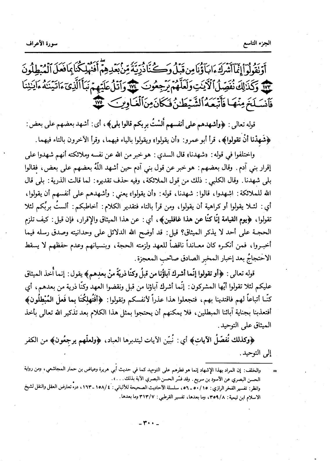 {أَوْ تَقُولُوا إِنَّمَا أَشْرَكَ آبَاؤُنَا مِنْ قَبْلُ وَكُنَّا ذُرِّيَّةً مِنْ بَعْدِهِمْ أَفَتُهْلِكُنَا بِمَا فَعَلَ الْمُبْطِلُونَ (173) وَكَذَلِكَ نُفَصِّلُ الْآيَاتِ وَلَعَلَّهُمْ يَرْجِعُونَ (174) وَاتْلُ عَلَيْهِمْ نَبَأَ الَّذِي آتَيْنَاهُ آيَاتِنَا فَانْسَلَخَ مِنْهَا فَأَتْبَعَهُ الشَّيْطَانُ فَكَانَ مِنَ الْغَاوِينَ (175) }