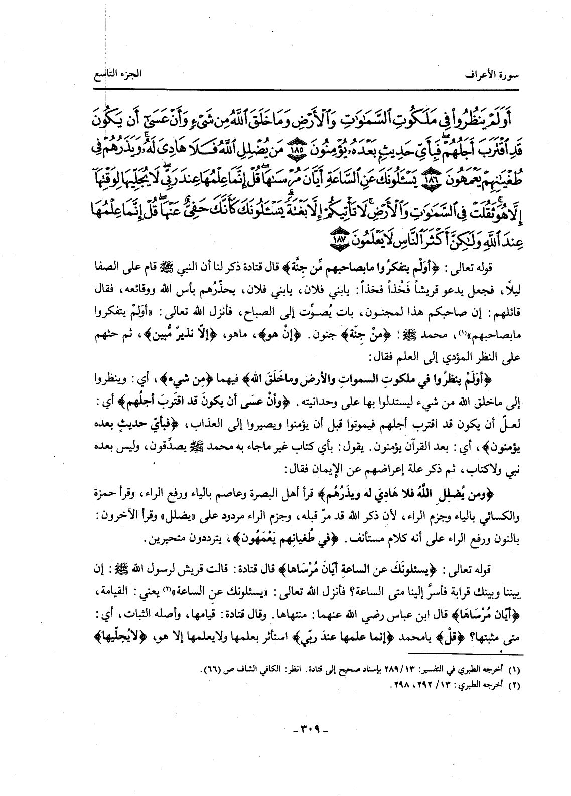 {أَوَلَمْ يَنْظُرُوا فِي مَلَكُوتِ السَّمَاوَاتِ وَالْأَرْضِ وَمَا خَلَقَ اللَّهُ مِنْ شَيْءٍ وَأَنْ عَسَى أَنْ يَكُونَ قَدِ اقْتَرَبَ أَجَلُهُمْ فَبِأَيِ حَدِيثٍ بَعْدَهُ يُؤْمِنُونَ (185) مَنْ يُضْلِلِ اللَّهُ فَلَا هَادِيَ لَهُ وَيَذَرُهُمْ فِي طُغْيَانِهِمْ يَعْمَهُونَ (186) يَسْأَلُونَكَ عَنِ السَّاعَةِ أَيَّانَ مُرْسَاهَا قُلْ إِنَّمَا عِلْمُهَا عِنْدَ رَبِّي لَا يُجَلِّيهَا لِوَقْتِهَا إِلَّا هُوَ ثَقُلَتْ فِي السَّمَاوَاتِ وَالْأَرْضِ لَا تَأْتِيكُمْ إِلَّا بَغْتَةً يَسْأَلُونَكَ كَأَنَّكَ حَفِيٌّ عَنْهَا قُلْ إِنَّمَا عِلْمُهَا عِنْدَ اللَّهِ وَلَكِنَّ أَكْثَرَ النَّاسِ لَا يَعْلَمُونَ (187) }