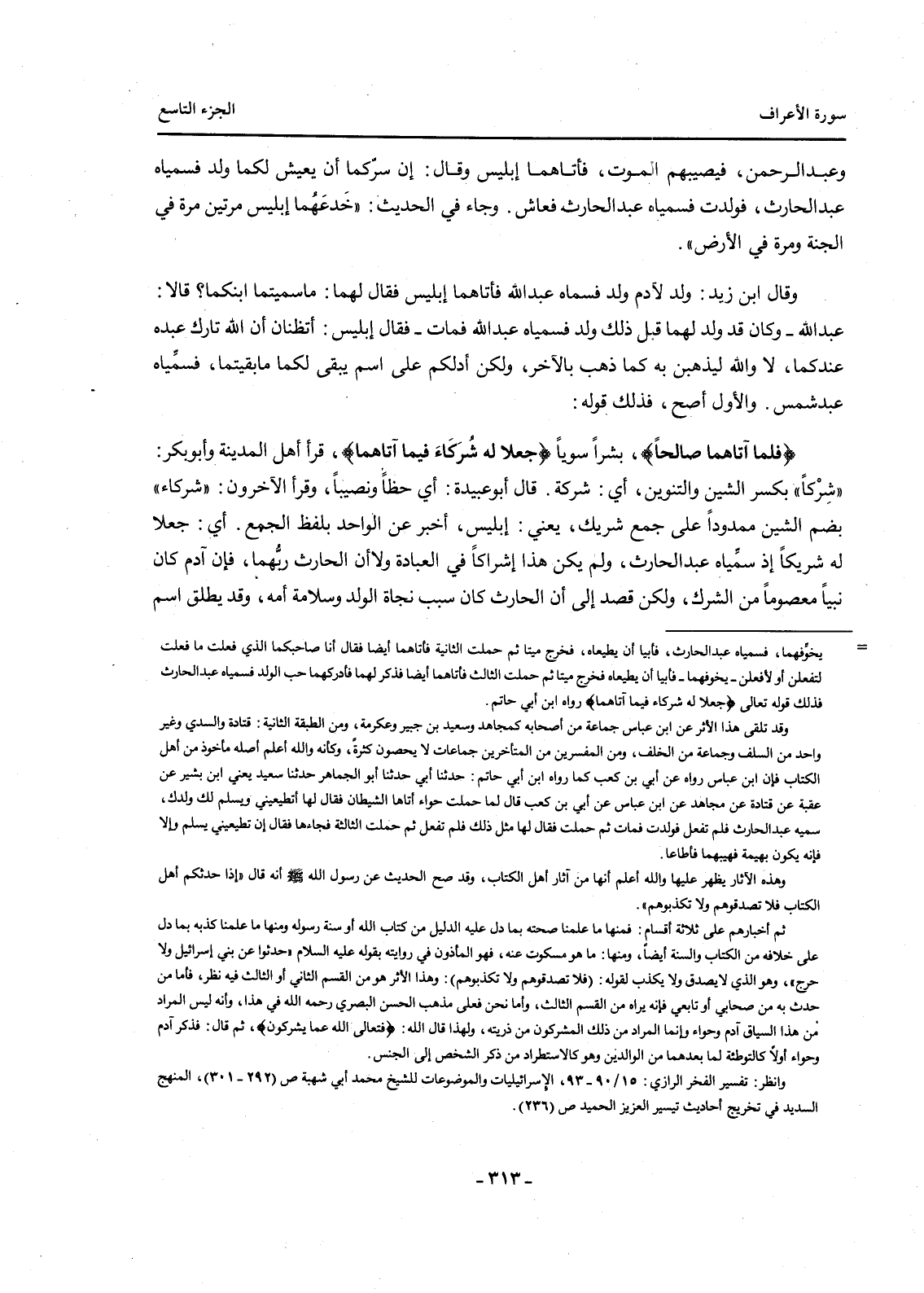 {فَلَمَّا آتَاهُمَا صَالِحًا} بَشَرًا سَوِيًّا {جَعَلَا لَهُ شُرَكَاءَ فِيمَا آتَاهُمَا} قَرَأَ أَهْلُ الْمَدِينَةِ وَأَبُو بَكْرٍ: "شِرْكًا" بِكَسْرِ الشِّينِ وَالتَّنْوِينِ، أَيْ: شَرِكَةً. قَالَ أَبُو عُبَيْدَةَ: أَيْ حَظًّا وَنَصِيبًا، وَقَرَأَ الْآخَرُونَ: "شُرَكَاءَ" بِضَمِّ الشِّينِ مَمْدُودًا عَلَى جَمْعِ شَرِيكٍ، يَعْنِي: إِبْلِيسَ، أَخْبَرَ عَنِ الْوَاحِدِ بِلَفْظِ الْجَمْعِ. أَيْ: جَعَلَا لَهُ شَرِيكًا إِذْ سَمَّيَاهُ عبد الحارث، ولمن يَكُنْ هَذَا إِشْرَاكًا فِي الْعِبَادَةِ وَلَا أَنَّ الْحَارِثَ رَبَّهُمَا، فَإِنَّ آدَمَ كَانَ نَبِيًّا مَعْصُومًا مِنَ الشِّرْكِ، وَلَكِنْ قَصَدَ إِلَى أَنَّ الْحَارِثَ كَانَ سَبَبَ نَجَاةِ الْوَلَدِ وَسَلَامَةِ أُمِّهِ، وَقَدْ يُطْلَقُ اسْمُ
