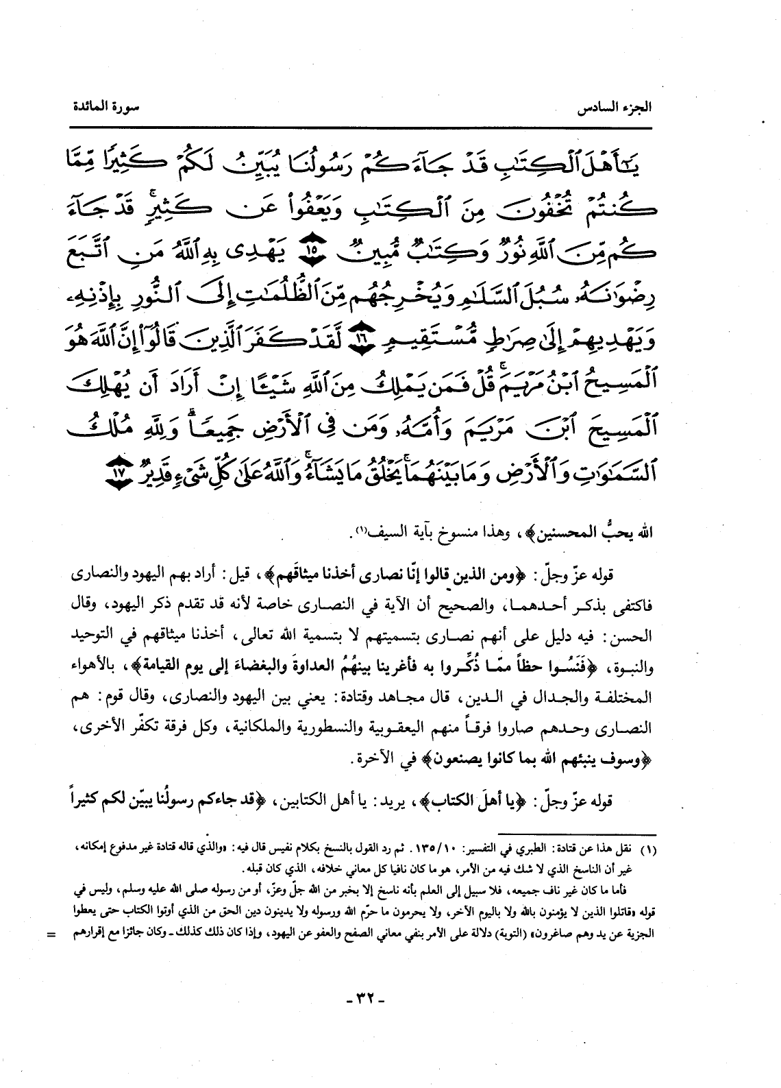 {يَا أَهْلَ الْكِتَابِ قَدْ جَاءَكُمْ رَسُولُنَا يُبَيِّنُ لَكُمْ كَثِيرًا مِمَّا كُنْتُمْ تُخْفُونَ مِنَ الْكِتَابِ وَيَعْفُو عَنْ كَثِيرٍ قَدْ جَاءَكُمْ مِنَ اللَّهِ نُورٌ وَكِتَابٌ مُبِينٌ (15) يَهْدِي بِهِ اللَّهُ مَنِ اتَّبَعَ رِضْوَانَهُ سُبُلَ السَّلَامِ وَيُخْرِجُهُمْ مِنَ الظُّلُمَاتِ إِلَى النُّورِ بِإِذْنِهِ وَيَهْدِيهِمْ إِلَى صِرَاطٍ مُسْتَقِيمٍ (16) لَقَدْ كَفَرَ الَّذِينَ قَالُوا إِنَّ اللَّهَ هُوَ الْمَسِيحُ ابْنُ مَرْيَمَ قُلْ فَمَنْ يَمْلِكُ مِنَ اللَّهِ شَيْئًا إِنْ أَرَادَ أَنْ يُهْلِكَ الْمَسِيحَ ابْنَ مَرْيَمَ وَأُمَّهُ وَمَنْ فِي الْأَرْضِ جَمِيعًا وَلِلَّهِ مُلْكُ السَّمَاوَاتِ وَالْأَرْضِ وَمَا بَيْنَهُمَا يَخْلُقُ مَا يَشَاءُ وَاللَّهُ عَلَى كُلِّ شَيْءٍ قَدِيرٌ (17) }