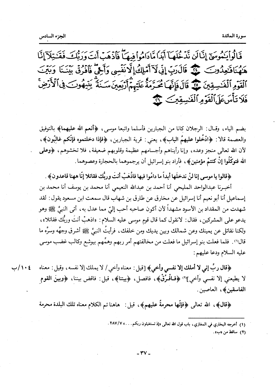 {قَالُوا يَا مُوسَى إِنَّا لَنْ نَدْخُلَهَا أَبَدًا مَا دَامُوا فِيهَا فَاذْهَبْ أَنْتَ وَرَبُّكَ فَقَاتِلا إِنَّا هَاهُنَا قَاعِدُونَ} أَخْبَرَنَا عَبْدُ الْوَاحِدِ الْمُلَيْحِيُّ أَنَا أَحْمَدُ بْنُ عَبْدِ اللَّهِ النُّعَيْمِيُّ أَنَا مُحَمَّدُ بْنُ يُوسُفَ أَنَا مُحَمَّدُ بْنُ إِسْمَاعِيلَ أَنَا أَبُو نُعَيْمٍ أَنَا إِسْرَائِيلُ عَنْ مُخَارِقٍ عَنْ طَارِقِ بْنِ شِهَابٍ قَالَ سَمِعْتُ ابْنَ مَسْعُودٍ يَقُولُ: لَقَدْ شَهِدْتُ مِنَ الْمِقْدَادِ بْنِ الْأَسْوَدِ مَشْهَدًا لَأَنْ أَكُونَ صَاحِبَهُ أَحَبُّ إِلَيَّ مِمَّا عُدِلَ بِهِ، أَتَى النَّبِيُّ صَلَّى اللَّهُ عَلَيْهِ وَسَلَّمَ وَهُوَ يَدْعُو عَلَى الْمُشْرِكِينَ، فَقَالَ: لَا نَقُولُ كَمَا قَالَ قَوْمُ مُوسَى عَلَيْهِ السَّلَامُ: "اذْهَبْ أَنْتَ وَرَبُّكَ فَقَاتِلَا" وَلَكِنَّا نُقَاتِلُ عَنْ يَمِينِكَ وَعَنْ شِمَالِكَ وَبَيْنَ يَدَيْكَ وَمِنْ خَلْفِكَ، فَرَأَيْتُ النَّبِيَّ صَلَّى اللَّهُ عَلَيْهِ وَسَلَّمَ أَشْرَقَ وَجْهُهُ وَسَرَّهُ مَا قَالَ (1) . فَلَمَّا فَعَلَتْ بَنُو إِسْرَائِيلَ مَا فَعَلَتْ مِنْ مُخَالَفَتِهِمْ أَمْرَ رَبِّهِمْ وَهَمِّهِمْ بِيُوشَعَ وَكَالِبَ غَضِبَ مُوسَى عَلَيْهِ السَّلَامُ وَدَعَا عَلَيْهِمْ.