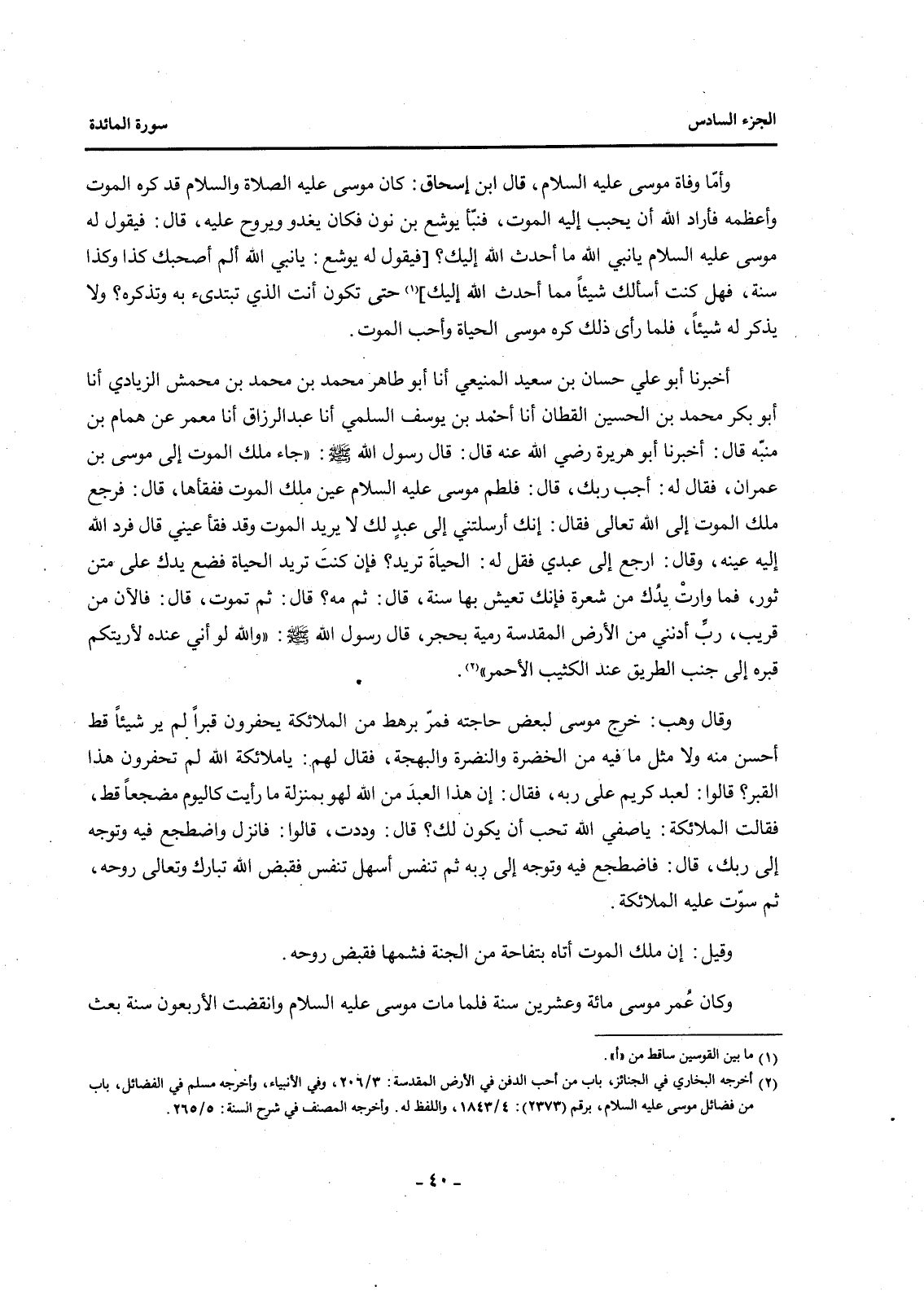 أَخْبَرَنَا أَبُو عَلِيٍّ حَسَّانُ بْنُ سَعِيدٍ الْمَنِيعِيُّ أَنَا أَبُو طَاهِرٍ مُحَمَّدُ بْنُ مُحَمَّدِ بْنِ مَحْمِشٍ الزِّيَادِيُّ أَنَا أَبُو بَكْرٍ مُحَمَّدُ بْنُ الْحُسَيْنِ الْقَطَّانُ أَنَا أَحْمَدُ بْنُ يُوسُفَ السُّلَمِيُّ أَنَا عَبْدُ الرَّزَّاقِ أَنَا مَعْمَرٌ عَنْ هَمَّامِ بْنِ مُنَبِّهٍ قَالَ: أَخْبَرَنَا أَبُو هُرَيْرَةَ رَضِيَ اللَّهُ عَنْهُ قَالَ: قَالَ رَسُولُ اللَّهِ صَلَّى اللَّهُ عَلَيْهِ وَسَلَّمَ: "جَاءَ مَلَكُ الْمَوْتِ إِلَى مُوسَى بْنِ عُمْرَانَ، فَقَالَ لَهُ: أَجِبْ رَبَّكَ، قَالَ: فَلَطَمَ مُوسَى عَلَيْهِ السَّلَامُ عَيْنَ مَلَكِ الْمَوْتِ فَفَقَأَهَا، قَالَ: فَرَجَعَ مَلَكُ الْمَوْتِ إِلَى اللَّهِ تَعَالَى فَقَالَ: إِنَّكَ أَرْسَلْتَنِي إِلَى عَبْدٍ لَكَ لَا يُرِيدُ الْمَوْتَ وَقَدْ فَقَأَ عَيْنِي قَالَ فَرَدَّ اللَّهُ إِلَيْهِ عَيْنَهُ، وَقَالَ: ارْجِعْ إِلَى عَبْدِي فَقُلْ لَهُ: الْحَيَاةَ تُرِيدُ؟ فَإِنْ كُنْتَ تُرِيدُ الْحَيَاةَ فَضَعْ يَدَكَ عَلَى مَتْنِ ثَوْرٍ، فَمَا وَارَتْ يَدُكَ مِنْ شَعْرَةٍ فَإِنَّكَ تَعِيشُ بِهَا سَنَةً، قَالَ: ثُمَّ مَهْ؟ قَالَ: ثُمَّ تَمُوتُ، قَالَ: فَالْآنَ مِنْ قَرِيبٍ، رَبِّ أَدْنِنِي مِنَ الْأَرْضِ الْمُقَدَّسَةِ رَمْيَةً بِحَجَرٍ، قَالَ رَسُولُ اللَّهِ صَلَّى اللَّهُ عَلَيْهِ وَسَلَّمَ: "وَاللَّهِ لَوْ أَنِّي عِنْدَهُ لَأَرَيْتُكُمْ قَبْرَهُ إِلَى جَنْبِ الطَّرِيقِ عِنْدَ الْكَثِيبِ الْأَحْمَرِ" (2) .