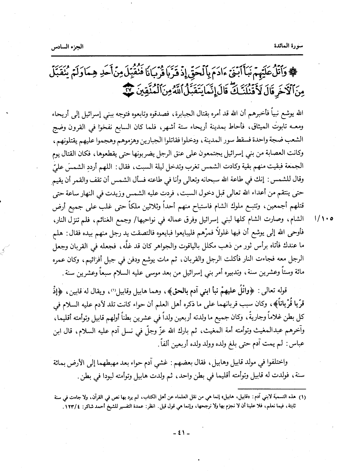 قَوْلُهُ تَعَالَى: {وَاتْلُ عَلَيْهِمْ نَبَأَ ابْنَيْ آدَمَ بِالْحَقِّ} وَهُمَا هَابِيلُ وَقَابِيلُ (1) وَيُقَالُ لَهُ قَابِينُ، {إِذْ قَرَّبَا قُرْبَانًا} وَكَانَ سَبَبُ قُرْبَانِهِمَا عَلَى مَا ذَكَرَهُ أَهْلُ الْعِلْمِ أَنَّ حَوَّاءَ كَانَتْ تَلِدُ لِآدَمَ عَلَيْهِ السَّلَامُ فِي كُلِّ بَطْنٍ غُلَامًا وَجَارِيَةً، وَكَانَ جَمِيعُ مَا وَلَدَتْهُ أَرْبَعِينَ وَلَدًا فِي عِشْرِينَ بَطْنًا أَوَّلُهُمْ قَابِيلُ وَتَوْأَمَتُهُ أَقْلِيمَا، وَآخِرُهُمْ عَبْدُ الْمُغِيثِ وَتَوْأَمَتُهُ أَمَةُ الْمُغِيثِ، ثُمَّ بَارَكَ اللَّهُ عَزَّ وَجَلَّ فِي نَسْلِ آدَمَ عَلَيْهِ السَّلَامُ، قَالَ ابْنُ عَبَّاسٍ: لَمْ يَمُتْ آدَمُ حَتَّى بَلَغَ وَلَدُهُ وَوَلَدُ وَلَدِهِ أَرْبَعِينَ أَلْفًا.