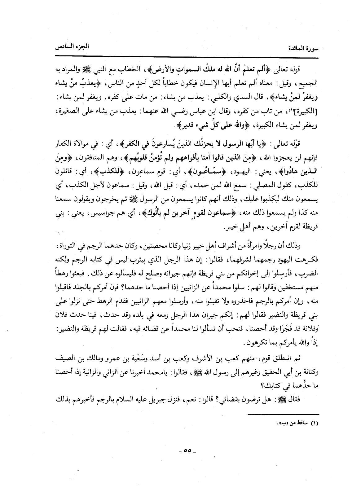 قَوْلُهُ تَعَالَى: {يَا أَيُّهَا الرَّسُولُ لَا يَحْزُنْكَ الَّذِينَ يُسَارِعُونَ فِي الْكُفْرِ} أَيْ: فِي مُوَالَاةِ الْكُفَّارِ فَإِنَّهُمْ لَمْ يُعْجِزُوا اللَّهَ، {مِنَ الَّذِينَ قَالُوا آمَنَّا بِأَفْوَاهِهِمْ وَلَمْ تُؤْمِنْ قُلُوبُهُمْ} وَهُمُ الْمُنَافِقُونَ، {وَمِنَ الَّذِينَ هَادُوا} يَعْنِي: الْيَهُودَ، {سَمَّاعُونَ} أَيْ: قَوْمٌ سَمَّاعُونَ، {لِلْكَذِبِ} أَيْ: قَائِلُونَ لِلْكَذِبِ، كَقَوْلِ الْمُصَلِّي: سَمِعَ اللَّهُ لِمَنْ حَمِدَهُ، أَيْ: قَبِلَ اللَّهُ، وَقِيلَ: سَمَّاعُونَ لِأَجْلِ الْكَذِبِ، أَيْ يَسْمَعُونَ مِنْكَ لِيَكْذِبُوا عَلَيْكَ، وَذَلِكَ أَنَّهُمْ كَانُوا يَسْمَعُونَ مِنَ الرَّسُولِ صَلَّى اللَّهُ عَلَيْهِ وَسَلَّمَ ثُمَّ يَخْرُجُونَ وَيَقُولُونَ سَمِعْنَا مِنْهُ كَذَا وَلَمْ يَسْمَعُوا ذَلِكَ مِنْهُ، {سَمَّاعُونَ لِقَوْمٍ آخَرِينَ لَمْ يَأْتُوكَ} أَيْ هُمْ جَوَاسِيسُ، يَعْنِي: بَنِي قُرَيْظَةَ لِقَوْمٍ آخَرِينَ، وَهُمْ أَهْلُ خَيْبَرَ.