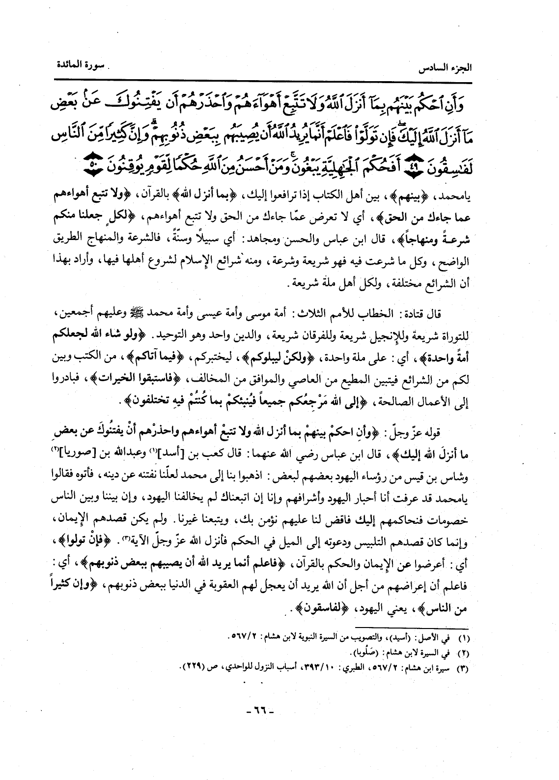 قَوْلُهُ عَزَّ وَجَلَّ: {وَأَنِ احْكُمْ بَيْنَهُمْ بِمَا أَنْزَلَ اللَّهُ وَلَا تَتَّبِعْ أَهْوَاءَهُمْ وَاحْذَرْهُمْ أَنْ يَفْتِنُوكَ عَنْ بَعْضِ مَا أَنْزَلَ اللَّهُ إِلَيْكَ} قَالَ ابْنُ عَبَّاسٍ رَضِيَ اللَّهُ عَنْهُمَا: قَالَ كَعْبُ بْنُ [أَسَدٍ] (1) وَعَبْدُ اللَّهِ بْنُ [صُورِيَّا] (2) وَشَاسُ بْنُ قَيْسٍ مِنْ رُؤَسَاءِ الْيَهُودِ بَعْضُهُمْ لِبَعْضٍ: اذْهَبُوا بِنَا إِلَى مُحَمَّدٍ لَعَلَّنَا نَفْتِنُهُ عَنْ دِينِهِ، فَأَتَوْهُ فَقَالُوا يَا مُحَمَّدُ قَدْ عَرَفْتَ أَنَّا أَحْبَارُ الْيَهُودِ وَأَشْرَافُهُمْ وَأَنَّا إِنِ اتَّبَعْنَاكَ لَمْ يُخَالِفْنَا الْيَهُودُ، وَإِنَّ بَيْنَنَا وَبَيْنَ النَّاسِ خُصُومَاتٍ فَنُحَاكِمُهُمْ إِلَيْكَ فَاقْضِ لَنَا عَلَيْهِمْ نُؤْمِنُ بِكَ، وَيَتْبَعُنَا غَيْرُنَا، وَلَمْ يَكُنْ قَصْدُهُمُ الْإِيمَانَ، وَإِنَّمَا كَانَ قَصْدُهُمُ التَّلْبِيسَ وَدَعْوَتَهُ إِلَى الْمَيْلِ فِي الْحُكْمِ فَأَنْزَلَ اللَّهُ عَزَّ وَجَلَّ الْآيَةَ (3) . {فَإِنْ تَوَلَّوْا} أَيْ: أَعْرَضُوا عَنِ الْإِيمَانِ وَالْحُكْمِ بِالْقُرْآنِ، {فَاعْلَمْ أَنَّمَا يُرِيدُ اللَّهُ أَنْ يُصِيبَهُمْ بِبَعْضِ ذُنُوبِهِمْ} أَيْ: فَاعْلَمْ أَنَّ إِعْرَاضَهُمْ مِنْ أَجْلِ أَنَّ اللَّهَ يُرِيدُ أَنْ يُعَجِّلَ لَهُمُ الْعُقُوبَةَ فِي الدُّنْيَا بِبَعْضِ ذُنُوبِهِمْ، {وَإِنَّ كَثِيرًا مِنَ النَّاسِ} يَعْنِي الْيَهُودَ، {لَفَاسِقُونَ}