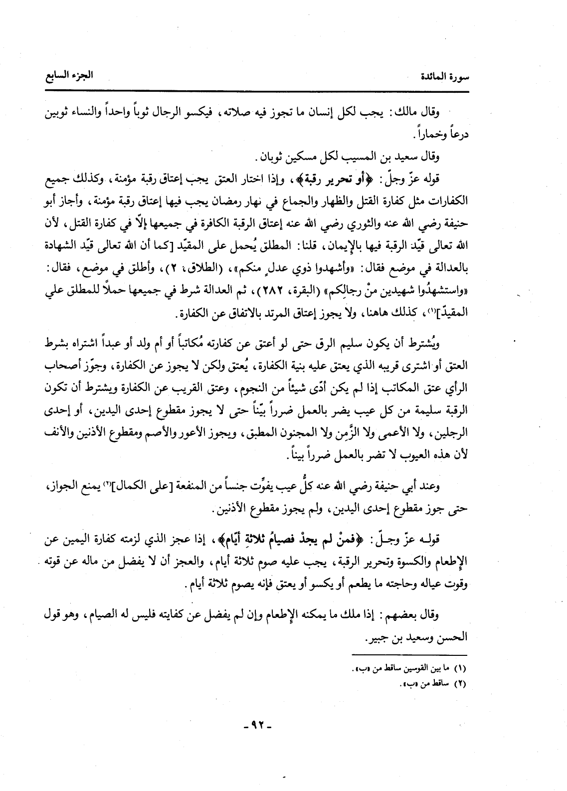 قَوْلُهُ عَزَّ وَجَلَّ: {أَوْ تَحْرِيرُ رَقَبَةٍ} وَإِذَا اخْتَارَ الْعِتْقَ يَجِبُ إِعْتَاقُ رَقَبَةٍ مُؤْمِنَةٍ، وَكَذَلِكَ جَمِيعُ الْكَفَّارَاتِ مِثْلُ كَفَّارَةِ الْقَتْلِ وَالظِّهَارِ وَالْجِمَاعِ فِي نَهَارِ رَمَضَانَ يَجِبُ فِيهَا إِعْتَاقُ رَقَبَةٍ مُؤْمِنَةٍ، وَأَجَازَ أَبُو حَنِيفَةَ رَضِيَ اللَّهُ عَنْهُ وَالثَّوْرِيُّ رَضِيَ اللَّهُ عَنْهُ إِعْتَاقَ الرَّقَبَةِ الْكَافِرَةِ فِي جَمِيعِهَا إِلَّا فِي كَفَّارَةِ الْقَتْلِ، لِأَنَّ اللَّهَ تَعَالَى قَيَّدَ الرَّقَبَةَ فِيهَا بِالْإِيمَانِ، قُلْنَا: الْمُطْلَقُ يُحْمَلُ عَلَى الْمُقَيَّدِ [كَمَا أَنَّ اللَّهَ تَعَالَى قَيَّدَ الشَّهَادَةَ بِالْعَدَالَةِ فِي مَوْضِعٍ فَقَالَ: "وَأَشْهِدُوا ذَوَيْ عَدْلٍ مِنْكُمْ"، (الطَّلَاقِ، 2) ، وَأُطْلِقَ فِي مَوْضِعٍ، فَقَالَ: "وَاسْتَشْهِدُوا شَهِيدَيْنِ مِنْ رِجَالِكُمْ" (الْبَقَرَةِ، 282) ، ثُمَّ الْعَدَالَةُ شَرْطٌ فِي جَمِيعِهَا حَمْلًا لِلْمُطْلَقِ عَلَى الْمُقَيَّدِ] (1) كَذَلِكَ هَاهُنَا، وَلَا يَجُوزُ إِعْتَاقُ الْمُرْتَدِّ بِالِاتِّفَاقِ عَنِ الْكَفَّارَةِ.
