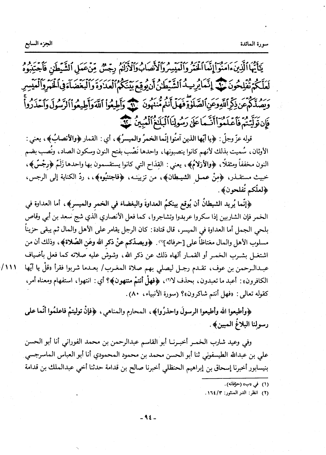 {يَا أَيُّهَا الَّذِينَ آمَنُوا إِنَّمَا الْخَمْرُ وَالْمَيْسِرُ وَالْأَنْصَابُ وَالْأَزْلَامُ رِجْسٌ مِنْ عَمَلِ الشَّيْطَانِ فَاجْتَنِبُوهُ لَعَلَّكُمْ تُفْلِحُونَ (90) إِنَّمَا يُرِيدُ الشَّيْطَانُ أَنْ يُوقِعَ بَيْنَكُمُ الْعَدَاوَةَ وَالْبَغْضَاءَ فِي الْخَمْرِ وَالْمَيْسِرِ وَيَصُدَّكُمْ عَنْ ذِكْرِ اللَّهِ وَعَنِ الصَّلَاةِ فَهَلْ أَنْتُمْ مُنْتَهُونَ (91) }