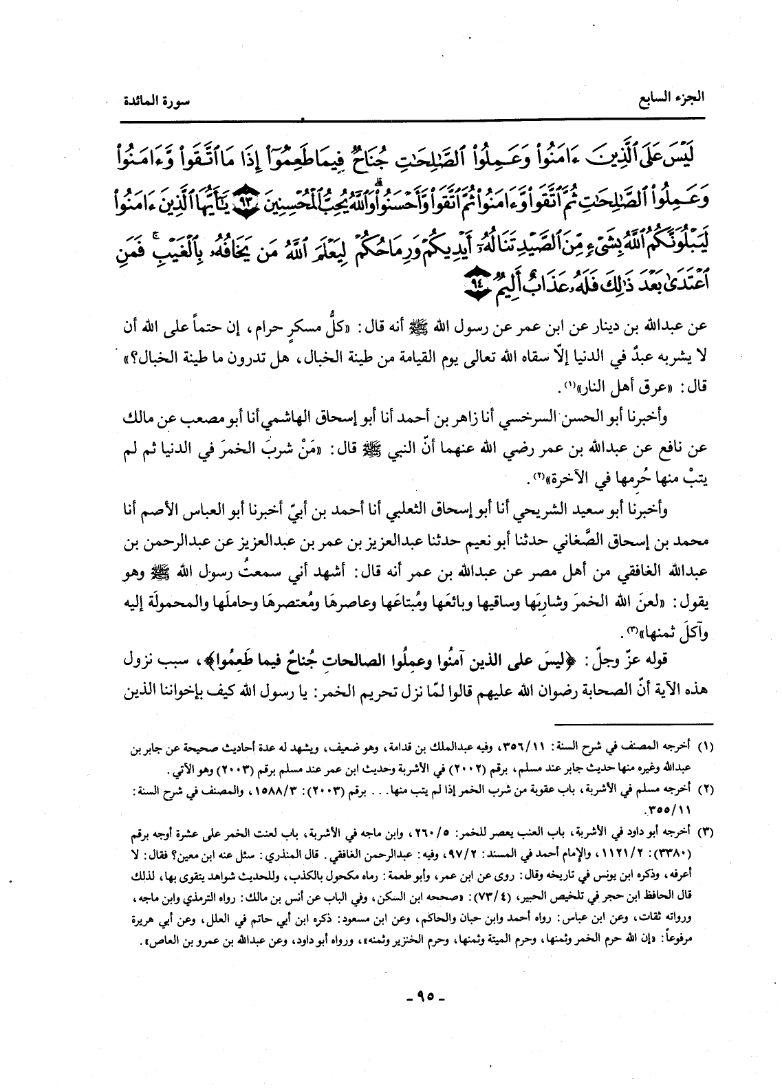 قَوْلُهُ عَزَّ وَجَلَّ: {لَيْسَ عَلَى الَّذِينَ آمَنُوا وَعَمِلُوا الصَّالِحَاتِ جُنَاحٌ فِيمَا طَعِمُوا} سَبَبُ نُزُولِ هَذِهِ الْآيَةِ أَنَّ الصَّحَابَةَ رِضْوَانُ اللَّهِ عَلَيْهِمْ قَالُوا لَمَّا نَزَلَ تَحْرِيمُ الْخَمْرِ: يَا رَسُولَ اللَّهِ كَيْفَ بِإِخْوَانِنَا الَّذِينَ