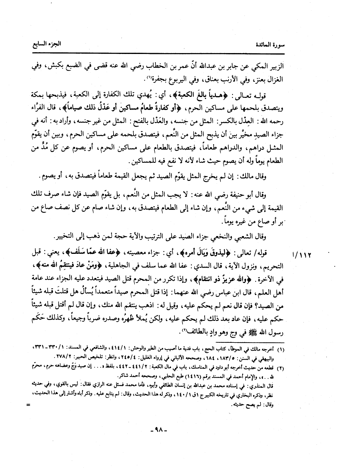 قوله 112\أتَعَالَى: {لِيَذُوقَ وَبَالَ أَمْرِهِ} أَيْ: جَزَاءَ مَعْصِيَتِهِ، {عَفَا اللَّهُ عَمَّا سَلَفَ} يَعْنِي: قَبْلَ التَّحْرِيمِ، وَنُزُولِ الْآيَةِ، قَالَ السُّدِّيُّ: عَفَا اللَّهُ عَمَّا سَلَفَ فِي الْجَاهِلِيَّةِ، {وَمَنْ عَادَ فَيَنْتَقِمُ اللَّهُ مِنْهُ} فِي الْآخِرَةِ. {وَاللَّهُ عَزِيزٌ ذُو انْتِقَامٍ} وَإِذَا تَكَرَّرَ مِنَ الْمُحْرِمِ قَتْلُ الصَّيْدِ فَيَتَعَدَّدُ عَلَيْهِ الْجَزَاءُ عِنْدَ عَامَّةِ أَهْلِ الْعِلْمِ، قَالَ ابْنُ عَبَّاسٍ رَضِيَ اللَّهُ عَنْهُمَا: إِذَا قَتَلَ الْمُحْرِمُ صَيْدًا مُتَعَمِّدًا يُسْأَلُ هَلْ قَتَلْتَ قَبْلَهُ شَيْئًا مِنَ الصَّيْدِ؟ فَإِنْ قَالَ نَعَمْ لَمْ يُحْكَمْ عَلَيْهِ، وَقِيلَ لَهُ: اذْهَبْ يَنْتَقِمُ اللَّهُ مِنْكَ، وَإِنْ قَالَ لَمْ أَقْتُلْ قَبْلَهُ شَيْئًا حُكِمَ عَلَيْهِ، فَإِنْ عَادَ بَعْدَ ذَلِكَ لَمْ يُحْكَمْ عَلَيْهِ، وَلَكِنْ يُمْلَأُ ظَهْرُهُ وَصَدْرُهُ ضَرْبًا وَجِيعًا، وَكَذَلِكَ حَكَمَ رَسُولُ اللَّهِ صَلَّى اللَّهُ عَلَيْهِ وَسَلَّمَ فِي وَجٍّ وَهُوَ وَادٍ بِالطَّائِفِ (2) .