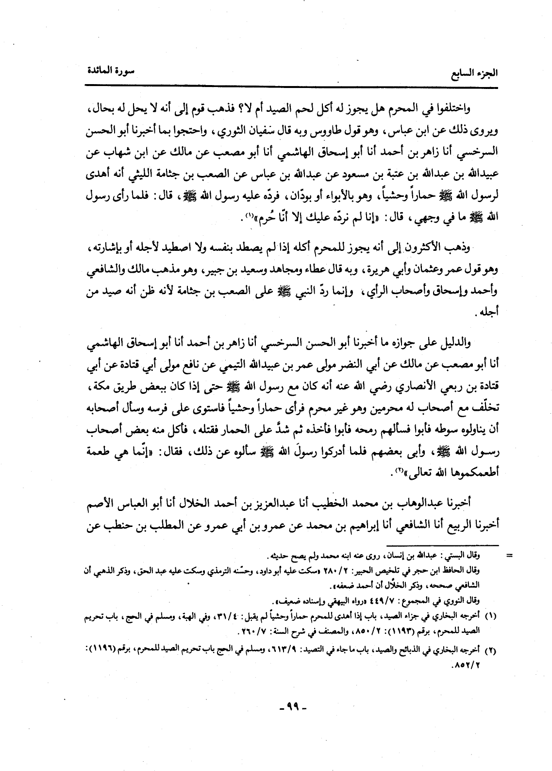 وَاخْتَلَفُوا فِي الْمُحْرِمِ هَلْ يَجُوزُ لَهُ أَكْلُ لَحْمِ الصَّيْدِ أَوْ لَا؟ فَذَهَبَ قَوْمٌ إِلَى أَنَّهُ لَا يَحِلُّ لَهُ بِحَالٍ، وَيُرْوَى ذَلِكَ عَنِ ابْنِ عَبَّاسٍ، وهو قول طاووس وَبِهِ قَالَ سُفْيَانُ الثَّوْرِيُّ، وَاحْتَجُّوا بِمَا أَخْبَرَنَا أَبُو الْحَسَنِ السَّرَخْسِيُّ أَنَا زَاهِرُ بْنُ أَحْمَدَ أَنَا أَبُو إِسْحَاقَ الْهَاشِمِيُّ أَنَا أَبُو مُصْعَبٍ عَنْ مَالِكٍ عَنِ ابْنِ شِهَابٍ عَنْ عُبَيْدِ اللَّهِ بْنِ عَبْدِ اللَّهِ بْنِ عُتْبَةَ بْنِ مَسْعُودٍ عَنْ عَبْدِ اللَّهِ بْنِ عَبَّاسٍ عَنِ الصَّعْبِ بْنِ جَثَّامَةَ اللِّيثِيِّ أَنَّهُ أَهْدَى لِرَسُولِ اللَّهِ صَلَّى اللَّهُ عَلَيْهِ وَسَلَّمَ حِمَارًا وَحْشِيًّا، وَهُوَ بِالْأَبْوَاءِ أَوْ بِوَدَّانَ، فَرَدَّهُ عَلَيْهِ رَسُولُ اللَّهِ صَلَّى اللَّهُ عَلَيْهِ وَسَلَّمَ، قَالَ: فَلَمَّا رَأَى رَسُولُ اللَّهِ صَلَّى اللَّهُ عَلَيْهِ وَسَلَّمَ مَا فِي وَجْهِي، قَالَ: "إِنَّا لَمْ نَرُدَّهُ عَلَيْكَ إِلَّا أَنَّا حُرُمٌ" (1) .