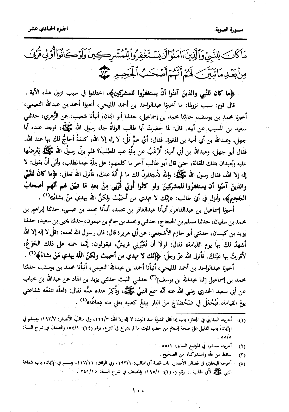 قَالَ قَوْمٌ: سَبَبُ نُزُولِهَا: مَا أَخْبَرَنَا عَبْدُ الْوَاحِد بْنُ أَحْمَدَ الْمَلِيحِيُّ، أَخْبَرَنَا أَحْمَدُ بْنُ عَبْدِ اللَّهِ النُّعَيْمِيُّ، أَخْبَرَنَا مُحَمَّدُ بْنُ يُوسُفَ، حَدَّثَنَا مُحَمَّدُ بْنُ إِسْمَاعِيلَ، حَدَّثَنَا أَبُو الْيَمَانِ، أَنْبَأَنَا شُعَيْبٌ، عَنْ الزُّهْرِيِّ، حَدَّثَنِي سَعِيدُ بْنُ الْمُسَيَّبِ عَنْ أَبِيهِ. قَالَ: لَمَّا حَضَرَتْ أَبَا طَالِبٍ الْوَفَاةُ جَاءَ رَسُولُ اللَّهِ صَلَّى اللَّهُ عَلَيْهِ وَسَلَّمَ، فَوَجَدَ عِنْدَهُ أَبَا جَهْلٍ، وَعَبْدَ اللَّهِ بْنَ أَبِي أُمَيَّةَ بْنِ الْمُغِيرَةِ: فَقَالَ: أَيْ عَمِّ قُلْ: لَا إِلَهَ إِلَّا اللَّهُ كَلِمَةً أُحَاجُّ لَكَ بِهَا عِنْدَ اللَّهِ. فَقَالَ أَبُو جَهْلٍ وَعَبْدُ اللَّهِ بْنُ أَبِي أُمَيَّةَ: أَتَرْغَبُ عَنْ مِلَّةِ عَبْدِ الْمُطَّلِبِ؟ فَلَمْ يَزَلْ رَسُولُ اللَّهِ صَلَّى اللَّهُ عَلَيْهِ وَسَلَّمَ يَعْرِضُهَا عَلَيْهِ وَيُعِيدَانِ بِتِلْكَ الْمَقَالَةِ، حَتَّى قَالَ أَبُو طَالِبٍ آخِرَ مَا كَلَّمَهُمْ: عَلَى مِلَّةِ عَبْدِ الْمُطَّلِبِ، وَأَبَى أَنْ يَقُولَ: لَا إِلَهَ إِلَّا اللَّهُ، فَقَالَ رَسُولُ اللَّهِ صَلَّى اللَّهُ عَلَيْهِ وَسَلَّمَ: وَاللَّهِ لَأَسْتَغْفِرَنَّ لَكَ مَا لَمْ أُنْهَ عَنْكَ، فَأَنْزَلَ اللَّهُ تَعَالَى: {مَا كَانَ لِلنَّبِيِّ وَالَّذِينَ آمَنُوا أَنْ يَسْتَغْفِرُوا لِلْمُشْرِكِينَ وَلَوْ كَانُوا أُولِي قُرْبَى مِنْ بَعْدِ مَا تَبَيَّنَ لَهُمْ أَنَّهُمْ أَصْحَابُ الْجَحِيمِ} وَأُنْزِلَ فِي أَبِي طَالِبٍ: "إِنَّكَ لَا تَهْدِي مَنْ أَحْبَبْتَ وَلَكِنَّ اللَّهَ يَهْدِي مَنْ يَشَاءُ" (1) .