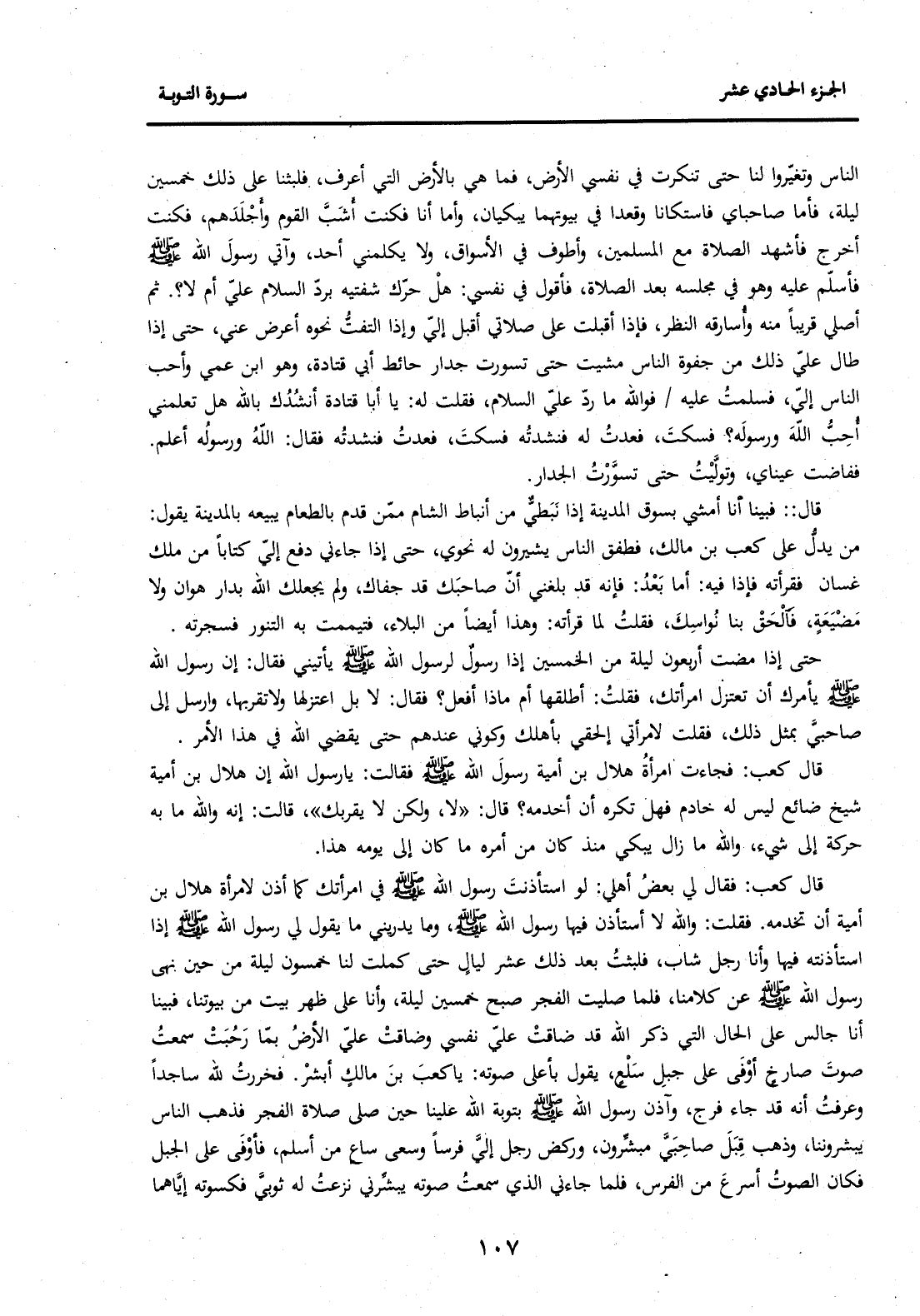 النَّاسُ وَتَغَيَّرُوا لَنَا حَتَّى تَنَكَّرَتْ فِي نَفْسِي الْأَرْضُ، فَمَا هِيَ بِالْأَرْضِ الَّتِي أَعْرِفُ، فَلَبِثْنَا عَلَى ذَلِكَ خَمْسِينَ لَيْلَةً، فَأَمَّا صَاحِبَايَ فَاسْتَكَانَا وَقَعَدَا فِي بُيُوتِهِمَا يَبْكِيَانِ، وَأَمَّا أَنَا فَكُنْتُ أَشَبَّ الْقَوْمِ وأَجْلَدَهُمْ، فَكُنْتُ أَخْرُجُ فَأَشْهَدُ الصَّلَاةَ مَعَ الْمُسْلِمِينَ، وَأَطُوفُ فِي الْأَسْوَاقِ، وَلَا يُكَلِّمُنِي أَحَدٌ، وَآتِي رَسُولَ اللَّهِ صَلَّى اللَّهُ عَلَيْهِ وَسَلَّمَ فَأُسَلِّمُ عَلَيْهِ وَهُوَ فِي مَجْلِسِهِ بَعْدَ الصَّلَاةِ، فَأَقُولُ فِي نَفْسِي: هَلْ حَرَّكَ شَفَتَيْهِ بِرَدِّ السَّلَامِ عَلَيَّ أَمْ لَا؟. ثُمَّ أُصَلِّي قَرِيبًا مِنْهُ وَأُسَارِقُهُ النَّظَرَ، فَإِذَا أَقْبَلْتُ عَلَى صَلَاتِي أَقْبَلَ إِلَيَّ وَإِذَا الْتَفَتُّ نَحْوَهُ أَعْرَضَ عَنِّي، حَتَّى إِذَا طَالَ عَلَيَّ ذَلِكَ مِنْ جَفْوَةِ النَّاسِ مَشَيْتُ حَتَّى تَسَوَّرْتُ جِدَارَ حَائِطِ أَبِي قَتَادَةَ، وَهُوَ ابْنُ عَمِّي وَأَحَبُّ النَّاسِ إِلَيَّ، فَسَلَّمْتُ عَلَيْهِ فَوَاللَّهِ مَا رَدَّ عَلَيَّ السَّلَامَ، فَقُلْتُ لَهُ: يَا أَبَا قَتَادَةَ أُنْشِدُكَ بِاللَّهِ هَلْ تَعْلَمُنِي أُحِبُّ اللَّهَ وَرَسُولَهُ؟ فَسَكَتَ، فَعُدْتُ لَهُ فَنَشَدْتُهُ فَسَكَتَ، فَعُدْتُ فَنَشَدْتُهُ فَقَالَ: اللَّهُ وَرَسُولُهُ أَعْلَمُ. فَفَاضَتْ عَيْنَايَ، وَتَوَلَّيْتُ حَتَّى تسوَّرْتُ الْجِدَارَ.