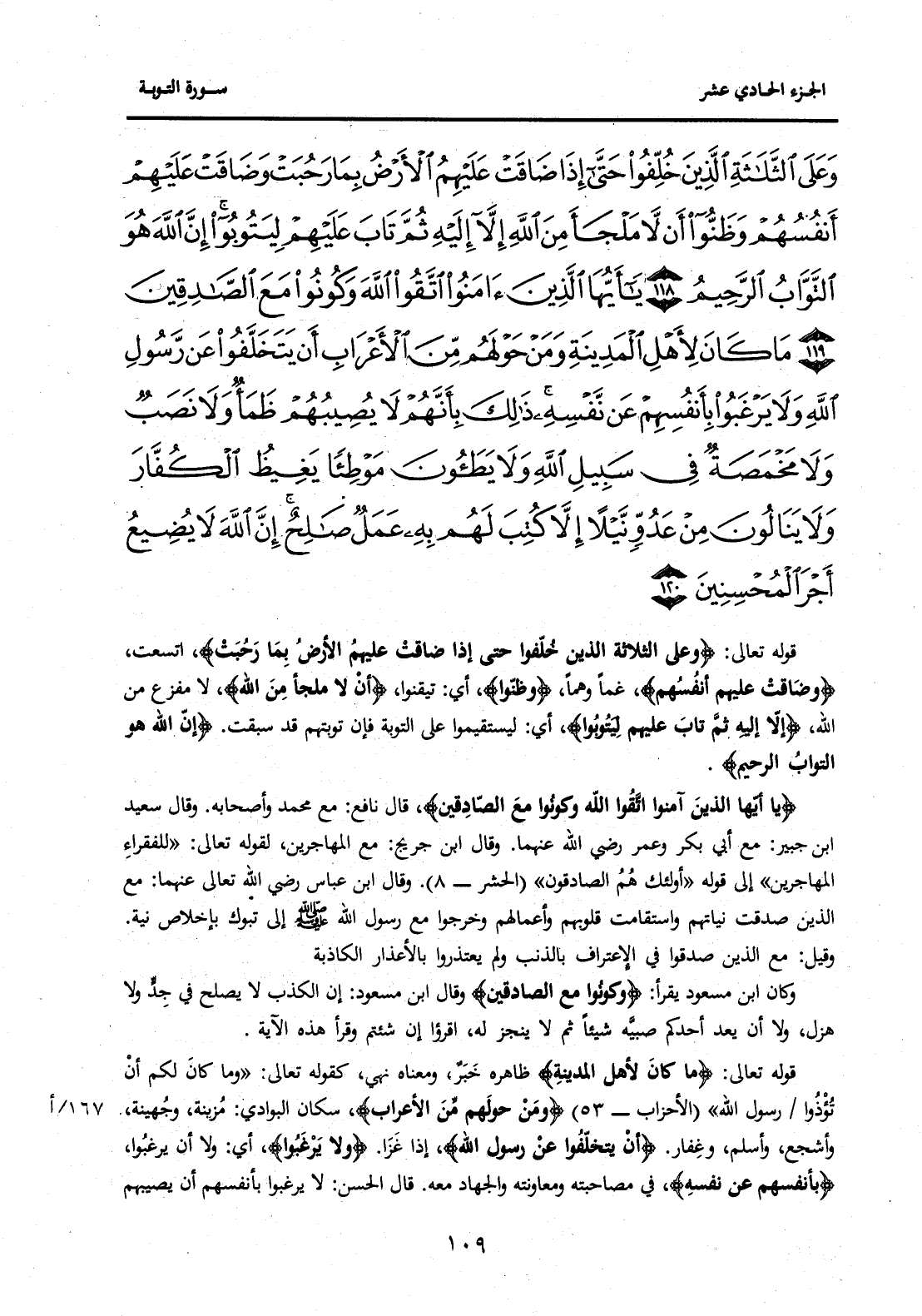 {وَعَلَى الثَّلَاثَةِ الَّذِينَ خُلِّفُوا حَتَّى إِذَا ضَاقَتْ عَلَيْهِمُ الْأَرْضُ بِمَا رَحُبَتْ وَضَاقَتْ عَلَيْهِمْ أَنْفُسُهُمْ وَظَنُّوا أَنْ لَا مَلْجَأَ مِنَ اللَّهِ إِلَّا إِلَيْهِ ثُمَّ تَابَ عَلَيْهِمْ لِيَتُوبُوا إِنَّ اللَّهَ هُوَ التَّوَّابُ الرَّحِيمُ (118) يَا أَيُّهَا الَّذِينَ آمَنُوا اتَّقُوا اللَّهَ وَكُونُوا مَعَ الصَّادِقِينَ (119) مَا كَانَ لِأَهْلِ الْمَدِينَةِ وَمَنْ حَوْلَهُمْ مِنَ الْأَعْرَابِ أَنْ يَتَخَلَّفُوا عَنْ رَسُولِ اللَّهِ وَلَا يَرْغَبُوا بِأَنْفُسِهِمْ عَنْ نَفْسِهِ ذَلِكَ بِأَنَّهُمْ لَا يُصِيبُهُمْ ظَمَأٌ وَلَا نَصَبٌ وَلَا مَخْمَصَةٌ فِي سَبِيلِ اللَّهِ وَلَا يَطَئُونَ مَوْطِئًا يَغِيظُ الْكُفَّارَ وَلَا يَنَالُونَ مِنْ عَدُوٍّ نَيْلًا إِلَّا كُتِبَ لَهُمْ بِهِ عَمَلٌ صَالِحٌ إِنَّ اللَّهَ لَا يُضِيعُ أَجْرَ الْمُحْسِنِينَ (120) } .