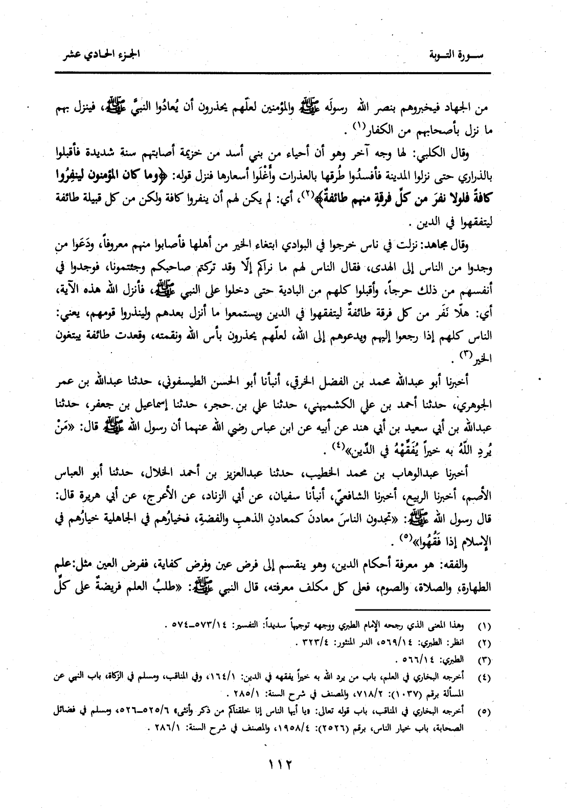 وَقَالَ الْكَلْبِيُّ: لَهَا وَجْهٌ آخَرُ وَهُوَ أَنَّ أَحْيَاءً مِنْ بَنِي أَسَدٍ مِنْ خُزَيْمَةَ أَصَابَتْهُمْ سَنَةٌ شَدِيدَةٌ فَأَقْبَلُوا بِالذَّرَارِيِّ حَتَّى نَزَلُوا الْمَدِينَةَ فَأَفْسَدُوا طُرُقَهَا بِالْعَذِرَاتِ وَأَغْلَوْا أَسْعَارَهَا فَنَزَلَ قَوْلُهُ: {وَمَا كَانَ الْمُؤْمِنُونَ لِيَنْفِرُوا كَافَّةً فَلَوْلَا نَفَرَ مِنْ كُلِّ فِرْقَةٍ مِنْهُمْ طَائِفَةٌ} (2) أَيْ: لَمْ يَكُنْ لَهُمْ أَنْ يَنْفِرُوا كَافَّةً وَلَكِنْ مِنْ كُلِّ قَبِيلَةٍ طَائِفَةٌ لِيَتَفَقَّهُوا فِي الدِّينِ.