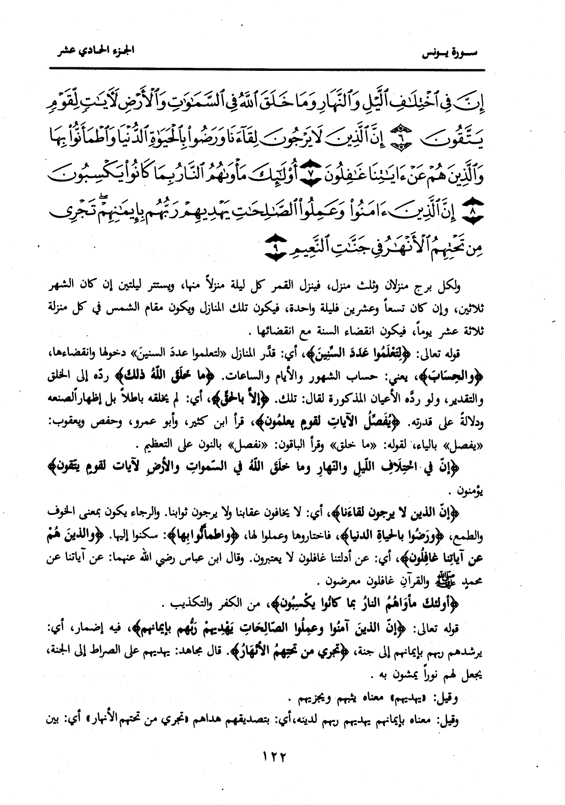 قَوْلُهُ تَعَالَى: {لِتَعْلَمُوا عَدَدَ السِّنِينَ} أَيْ: قَدْرَ الْمَنَازِلِ "لِتَعْلَمُوا عَدَدَ السِّنِينَ" دُخُولَهَا وَانْقِضَاءَهَا، {وَالْحِسَابَ} يَعْنِي: حِسَابَ الشُّهُورِ وَالْأَيَّامِ وَالسَّاعَاتِ. {مَا خَلَقَ اللَّهُ ذَلِكَ} رَدَّهُ إِلَى الْخَلْقِ وَالتَّقْدِيرِ، وَلَوْ رَدَّهُ إِلَى الْأَعْيَانِ الْمَذْكُورَةِ لَقَالَ: تِلْكَ. {إِلَّا بِالْحَقِّ} أَيْ: لَمْ يَخْلُقْهُ بَاطِلًا بَلْ إِظْهَارًا لِصُنْعِهِ وَدَلَالَةً عَلَى قُدْرَتِهِ. {يُفَصِّلُ الْآيَاتِ لِقَوْمٍ يَعْلَمُونَ} قَرَأَ ابْنُ كَثِيرٍ، وَأَبُو عَمْرٍو، وَحَفْصٌ وَيَعْقُوبُ: "يَفَصِّلُ" بِالْيَاءِ، لِقَوْلِهِ: "مَا خَلَقَ" وَقَرَأَ الْبَاقُونَ: "نُفَصِّلُ" بِالنُّونِ عَلَى التَّعْظِيمِ.