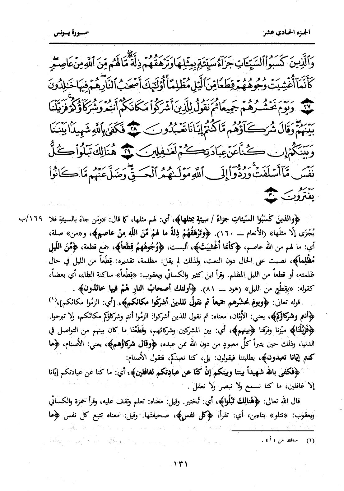 {وَالَّذِينَ كَسَبُوا السَّيِّئَاتِ جَزَاءُ سَيِّئَةٍ بِمِثْلِهَا وَتَرْهَقُهُمْ ذِلَّةٌ مَا لَهُمْ مِنَ اللَّهِ مِنْ عَاصِمٍ كَأَنَّمَا أُغْشِيَتْ وُجُوهُهُمْ قِطَعًا مِنَ اللَّيْلِ مُظْلِمًا أُولَئِكَ أَصْحَابُ النَّارِ هُمْ فِيهَا خَالِدُونَ (27) وَيَوْمَ نَحْشُرُهُمْ جَمِيعًا ثُمَّ نَقُولُ لِلَّذِينَ أَشْرَكُوا مَكَانَكُمْ أَنْتُمْ وَشُرَكَاؤُكُمْ فَزَيَّلْنَا بَيْنَهُمْ وَقَالَ شُرَكَاؤُهُمْ مَا كُنْتُمْ إِيَّانَا تَعْبُدُونَ (28) فَكَفَى بِاللَّهِ شَهِيدًا بَيْنَنَا وَبَيْنَكُمْ إِنْ كُنَّا عَنْ عِبَادَتِكُمْ لَغَافِلِينَ (29) هُنَالِكَ تَبْلُو كُلُّ نَفْسٍ مَا أَسْلَفَتْ وَرُدُّوا إِلَى اللَّهِ مَوْلَاهُمُ الْحَقِّ وَضَلَّ عَنْهُمْ مَا كَانُوا يَفْتَرُونَ (30) } .