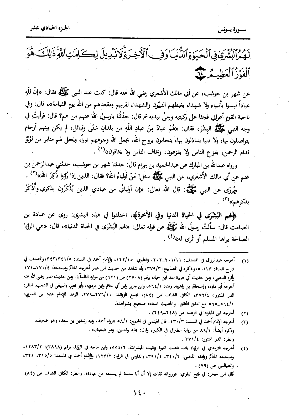 (1) أخرجه عبد الرزاق في المصنف: 11 / 201-202، والطبري: 15 / 122، والإمام أحمد في المسند: 5 / 341، 343، والمصنف في شرح السنة: 13 / 50، وذكره في المصابيح: 3 / 379، وله شاهد من حديث ابن عمر أخرجه الحاكم وصححه: 4 / 170-171 وأقره الذهبي، ومن حديث أبي هريرة عند ابن حبان برقم (2508) ص (621) من موارد الظمآن. ومن حديث عمر رضي الله عنه أخرجه أبو داود، وإسحاق بن راهويه، وهناد 1 / 564، وابن جرير وابن أبي حاتم وابن مردويه، وأبو نعيم. والبيهقي في الشعب. انظر: الدر المنثور: 4 / 372، الكافي الشاف ص (84) ، مجمع الزوائد: 10 / 276-279، الزهد للإمام هناد بن السري: 1 / 564-565 مع تعليق المحقق. والحديث إسناده صحيح بشواهده.
