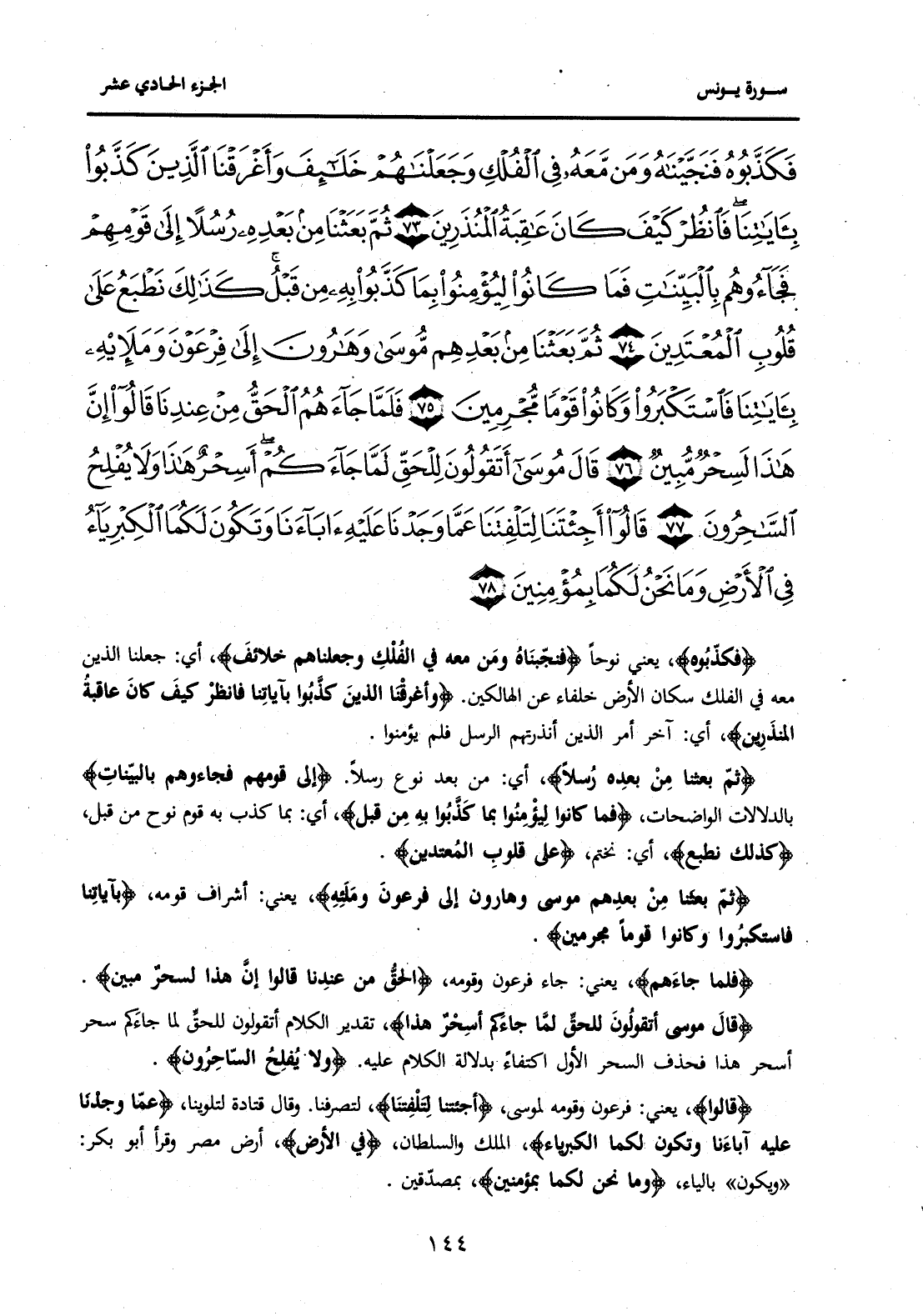 {فَكَذَّبُوهُ فَنَجَّيْنَاهُ وَمَنْ مَعَهُ فِي الْفُلْكِ وَجَعَلْنَاهُمْ خَلَائِفَ وَأَغْرَقْنَا الَّذِينَ كَذَّبُوا بِآيَاتِنَا فَانْظُرْ كَيْفَ كَانَ عَاقِبَةُ الْمُنْذَرِينَ (73) ثُمَّ بَعَثْنَا مِنْ بَعْدِهِ رُسُلًا إِلَى قَوْمِهِمْ فَجَاءُوهُمْ بِالْبَيِّنَاتِ فَمَا كَانُوا لِيُؤْمِنُوا بِمَا كَذَّبُوا بِهِ مِنْ قَبْلُ كَذَلِكَ نَطْبَعُ عَلَى قُلُوبِ الْمُعْتَدِينَ (74) ثُمَّ بَعَثْنَا مِنْ بَعْدِهِمْ مُوسَى وَهَارُونَ إِلَى فِرْعَوْنَ وَمَلَئِهِ بِآيَاتِنَا فَاسْتَكْبَرُوا وَكَانُوا قَوْمًا مُجْرِمِينَ (75) فَلَمَّا جَاءَهُمُ الْحَقُّ مِنْ عِنْدِنَا قَالُوا إِنَّ هَذَا لَسِحْرٌ مُبِينٌ (76) قَالَ مُوسَى أَتَقُولُونَ لِلْحَقِّ لَمَّا جَاءَكُمْ أَسِحْرٌ هَذَا وَلَا يُفْلِحُ السَّاحِرُونَ (77) قَالُوا أَجِئْتَنَا لِتَلْفِتَنَا عَمَّا وَجَدْنَا عَلَيْهِ آبَاءَنَا وَتَكُونَ لَكُمَا الْكِبْرِيَاءُ فِي الْأَرْضِ وَمَا نَحْنُ لَكُمَا بِمُؤْمِنِينَ (78) } .