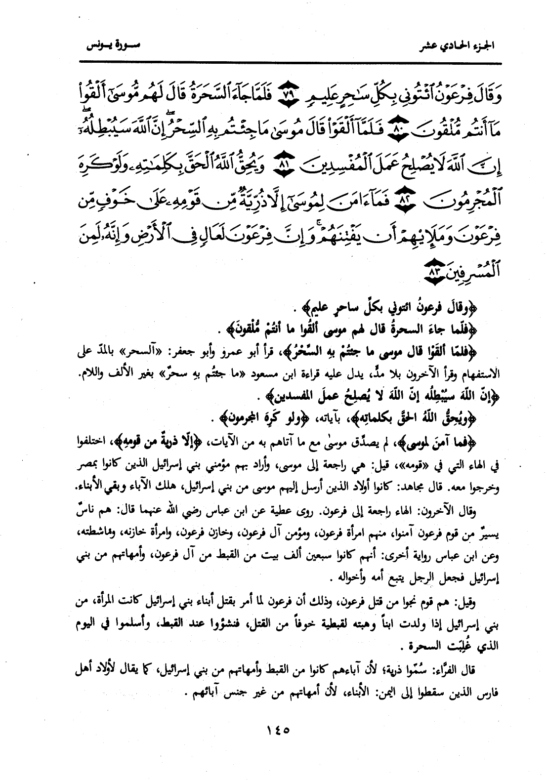 {وَقَالَ فِرْعَوْنُ ائْتُونِي بِكُلِّ سَاحِرٍ عَلِيمٍ79 فَلَمَّا جَاءَ السَّحَرَةُ قَالَ لَهُمْ مُوسَى أَلْقُوا مَا أَنْتُمْ مُلْقُونَ80 فَلَمَّا أَلْقَوْا قَالَ مُوسَى مَا جِئْتُمْ بِهِ السِّحْرُ إِنَّ اللَّهَ سَيُبْطِلُهُ إِنَّ اللَّهَ لَا يُصْلِحُ عَمَلَ الْمُفْسِدِينَ (81) وَيُحِقُّ اللَّهُ الْحَقَّ بِكَلِمَاتِهِ وَلَوْ كَرِهَ الْمُجْرِمُونَ (82) فَمَا آمَنَ لِمُوسَى إِلَّا ذُرِّيَّةٌ مِنْ قَوْمِهِ عَلَى خَوْفٍ مِنْ فِرْعَوْنَ وَمَلَئِهِمْ أَنْ يَفْتِنَهُمْ وَإِنَّ فِرْعَوْنَ لَعَالٍ فِي الْأَرْضِ وَإِنَّهُ لَمِنَ الْمُسْرِفِينَ (83) } .