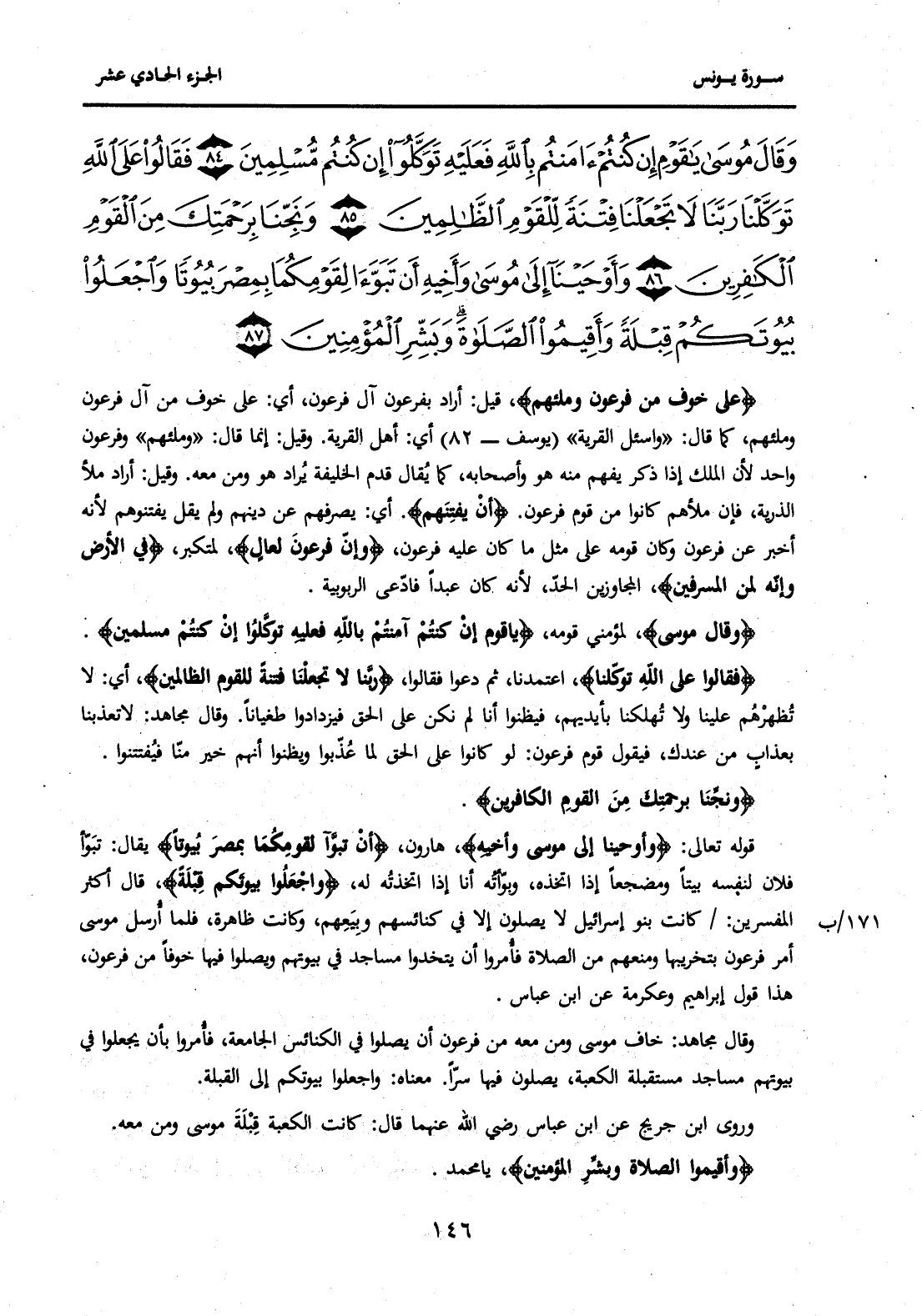 {وَقَالَ مُوسَى يَا قَوْمِ إِنْ كُنْتُمْ آمَنْتُمْ بِاللَّهِ فَعَلَيْهِ تَوَكَّلُوا إِنْ كُنْتُمْ مُسْلِمِينَ (84) فَقَالُوا عَلَى اللَّهِ تَوَكَّلْنَا رَبَّنَا لَا تَجْعَلْنَا فِتْنَةً لِلْقَوْمِ الظَّالِمِينَ (85) وَنَجِّنَا بِرَحْمَتِكَ مِنَ الْقَوْمِ الْكَافِرِينَ (86) وَأَوْحَيْنَا إِلَى مُوسَى وَأَخِيهِ أَنْ تَبَوَّآ لِقَوْمِكُمَا بِمِصْرَ بُيُوتًا وَاجْعَلُوا بُيُوتَكُمْ قِبْلَةً وَأَقِيمُوا الصَّلَاةَ وَبَشِّرِ الْمُؤْمِنِينَ (87) } .